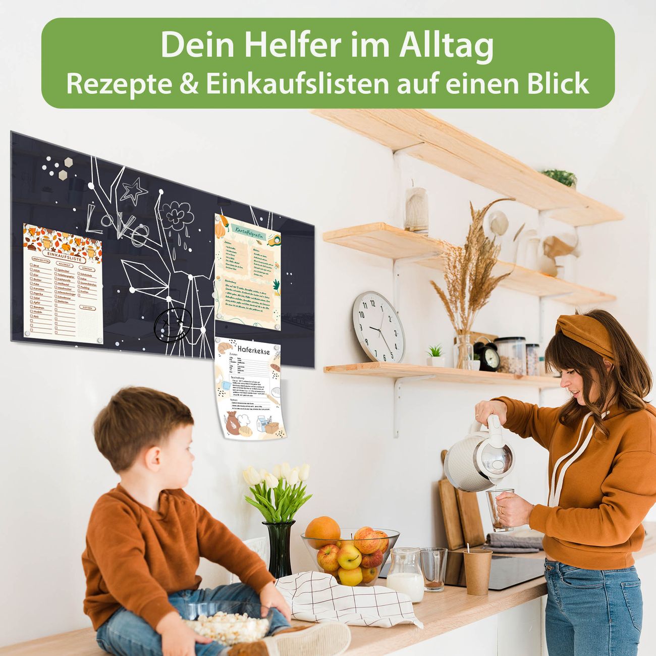 Auf der glatten Glasoberfläche lassen sich Termine, Rezepte oder Notizen ganz einfach mit Kreidestiften festhalten und rückstandslos entfernen. Starke Neodym-Magnete halten Ihre wichtigsten Erinnerungen sicher an Ort und Stelle. So entsteht Ihre ganz persönliche Ideenwand - jeden Tag neu.