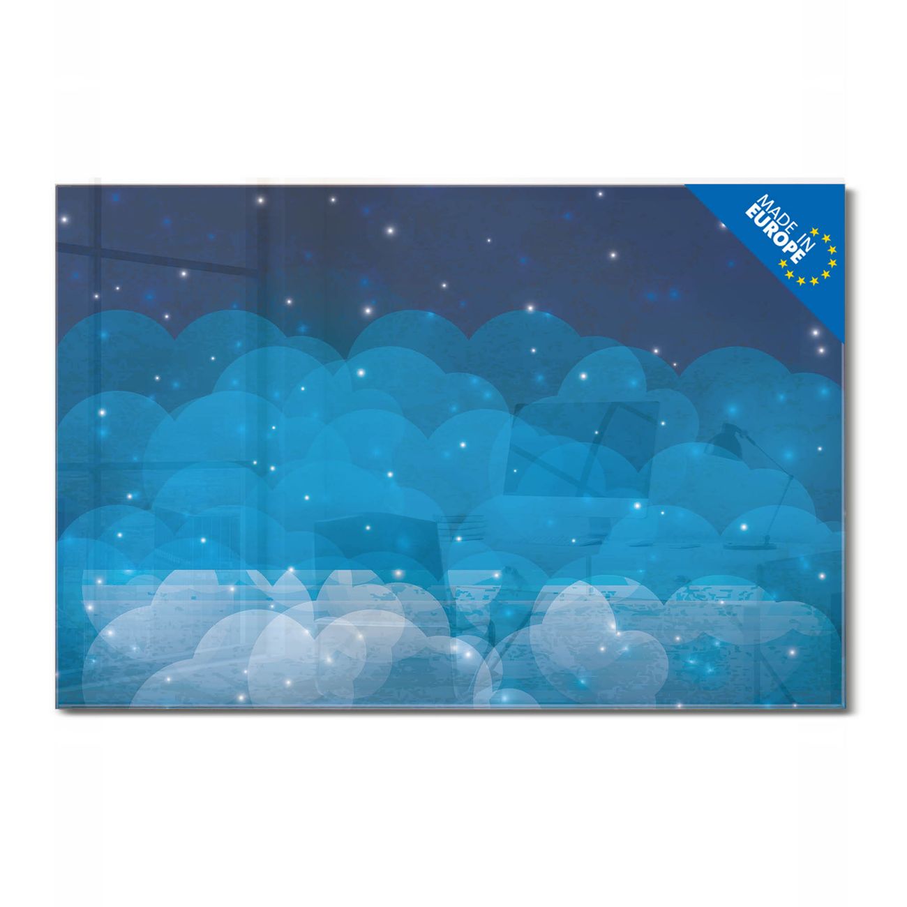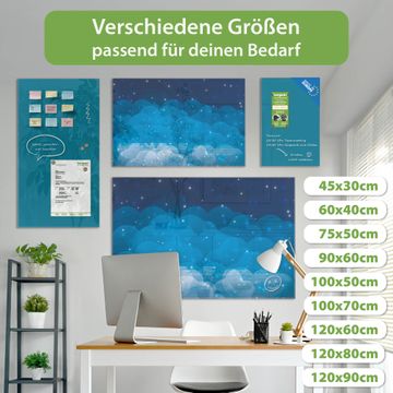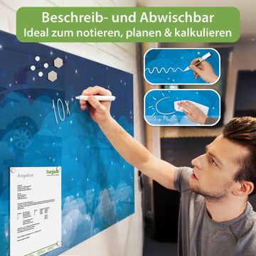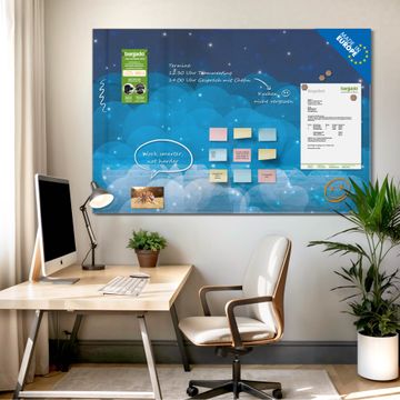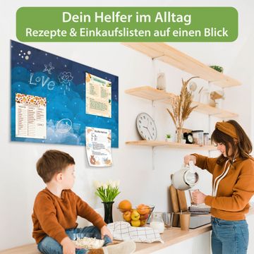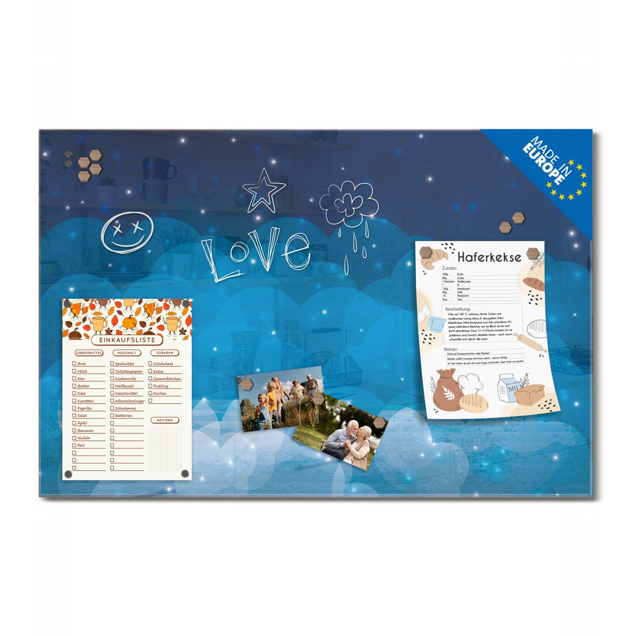 Material: 4mm Sicherheitsglas mit Metallrückwand Eigenschaften: beschreibbar, magnetisch, kratzfest Maße: 45x30x0,6cm, 2,03kg schwer Motiv Nummer 12852 Sternenhimmel 2 Zubehör: inklusive 4 Neodym-Magnete