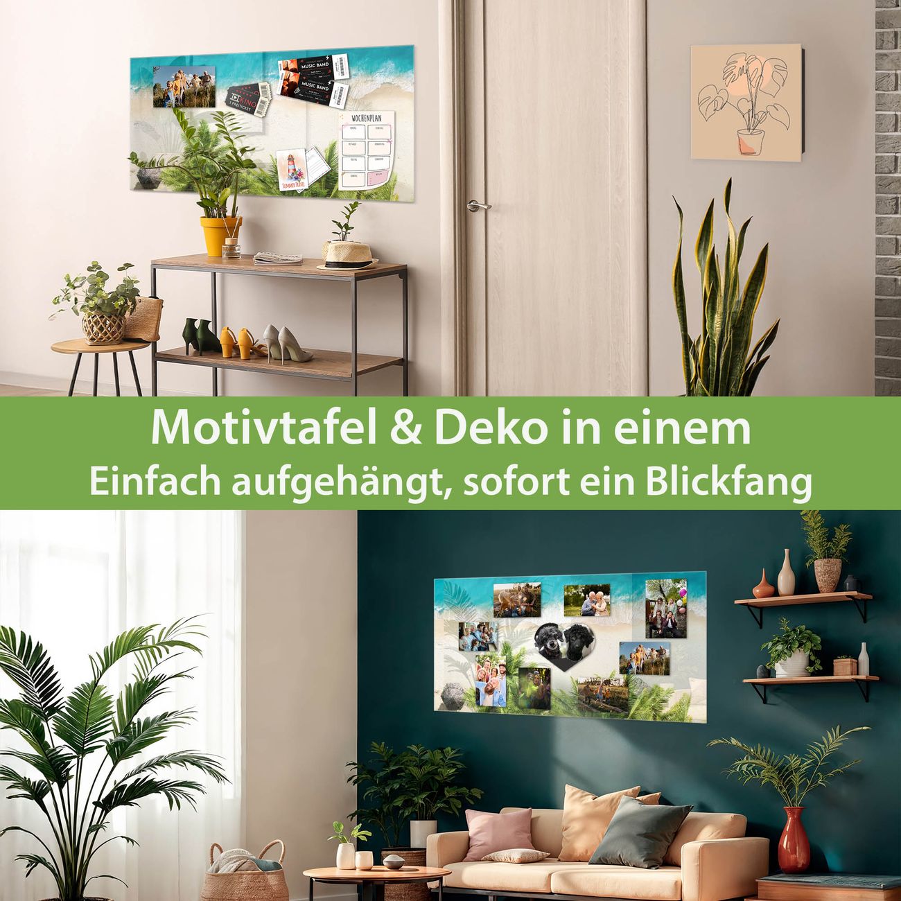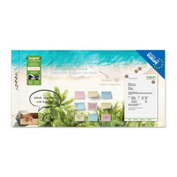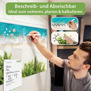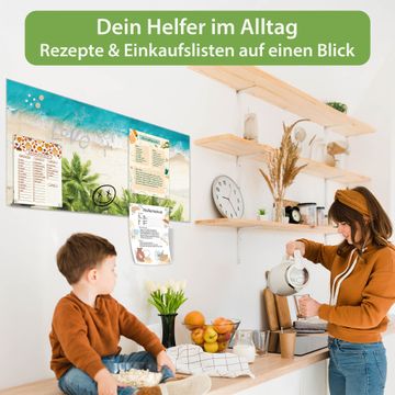Material: 4mm Sicherheitsglas mit Metallrückwand Eigenschaften: beschreibbar, magnetisch, kratzfest Maße: 120x60x0,6cm, 10,80kg schwer Motiv Nummer 12868 Strandtag Zubehör: inklusive 4 Neodym-Magnete