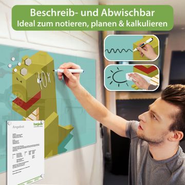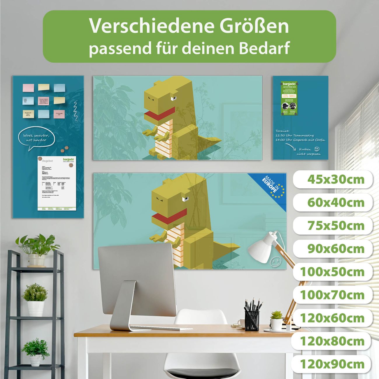 Material: 4mm Sicherheitsglas mit Metallrückwand Eigenschaften: beschreibbar, magnetisch, kratzfest Maße: 120x60x0,6cm, 10,80kg schwer Motiv Nummer 12949 T-Rex Block Zubehör: inklusive 4 Neodym-Magnete