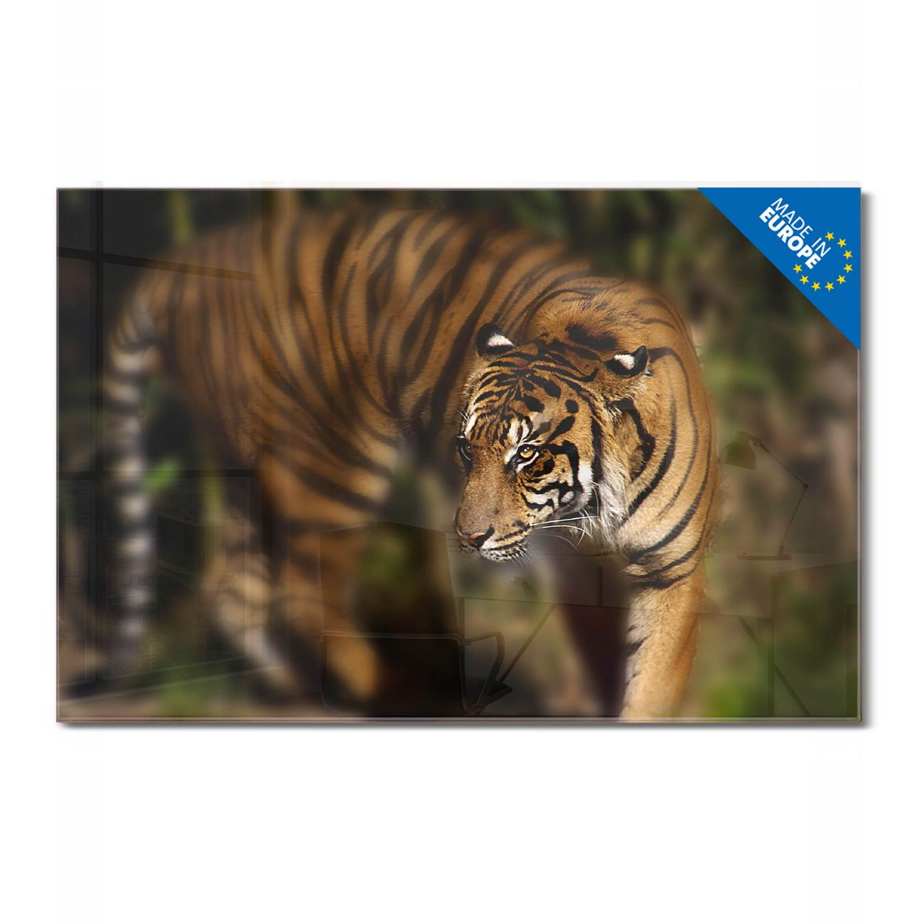 Material: 4mm Sicherheitsglas mit Metallrückwand Eigenschaften: beschreibbar, magnetisch, kratzfest Maße: 120x60x0,6cm, 10,80kg schwer Motiv Nummer 10502 Tiger Zubehör: inklusive 4 Neodym-Magnete