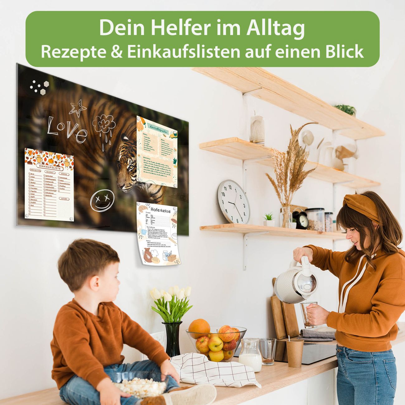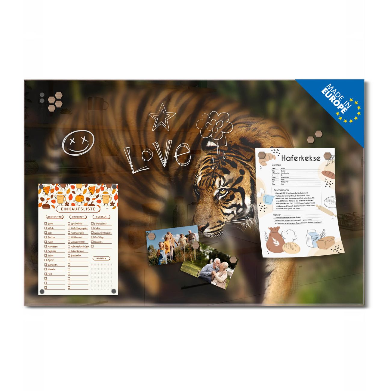 Ein Stück Design, das Ihren Alltag organisiert. Schreiben, heften, inspirieren - alles an einem Ort. Qualität, die man spürt. Montage leicht gemacht. Handwerk mit Herz - veredelt in Sachsen. Einzigartiges Design mit Motiv Motiv Tiger Beschreibbare Glasoberfläche, leicht zu reinigen Starke Magnetkraft durch Stahlrückwand Inklusive 4 Neodym-Magneten Flexible Montageoptionen Handveredelt in Sachsen - Qualität, die bleibt