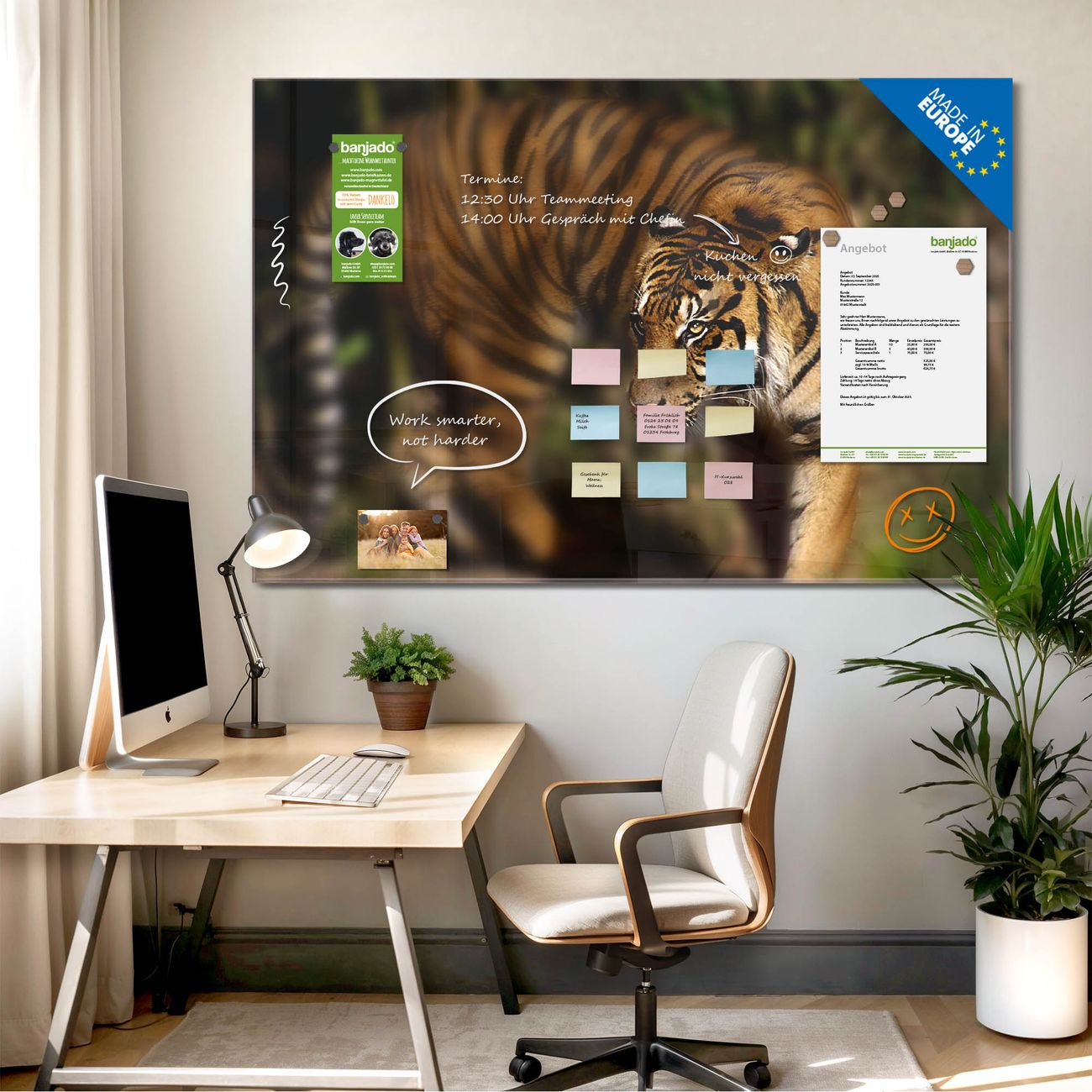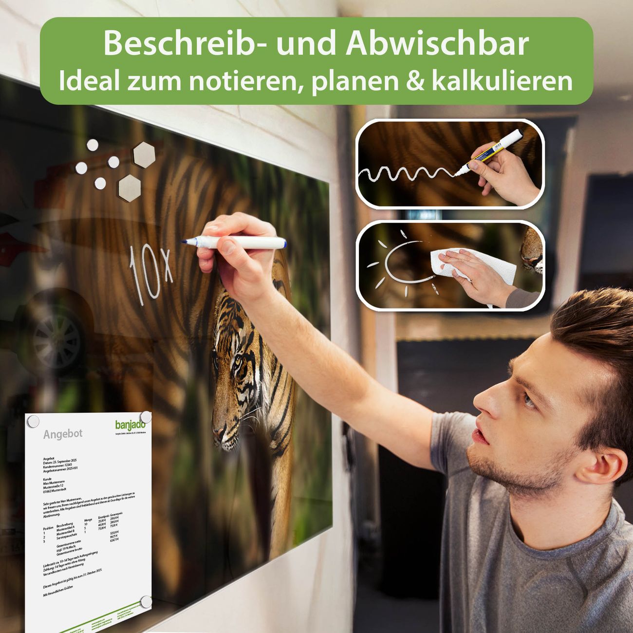 Jede Glas Magnettafel wird in unserer Werkstatt von Hand gefertigt und sorgfältig geprüft. So erhalten Sie ein echtes Qualitätsprodukt, das Funktion und Ästhetik perfekt vereint.?? Warum banjado?