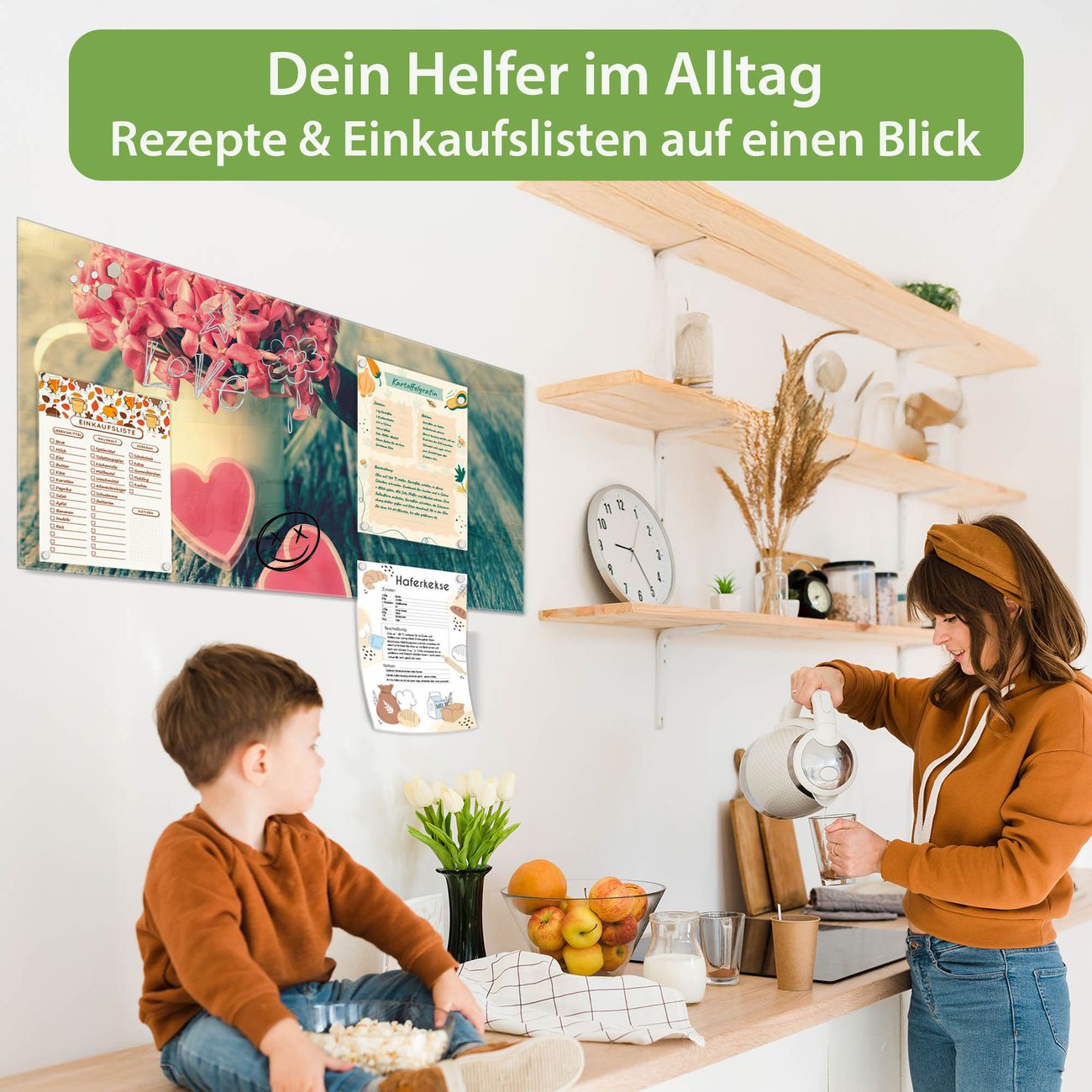 Auf der glatten Glasoberfläche lassen sich Termine, Rezepte oder Notizen ganz einfach mit Kreidestiften festhalten und rückstandslos entfernen. Starke Neodym-Magnete halten Ihre wichtigsten Erinnerungen sicher an Ort und Stelle. So entsteht Ihre ganz persönliche Ideenwand - jeden Tag neu.