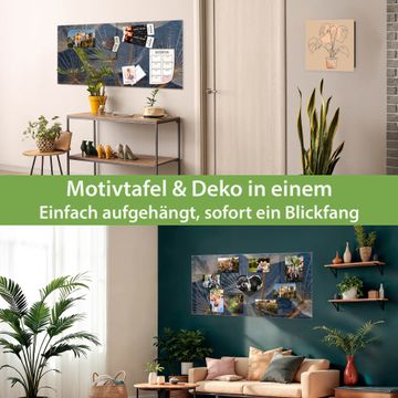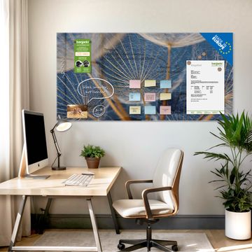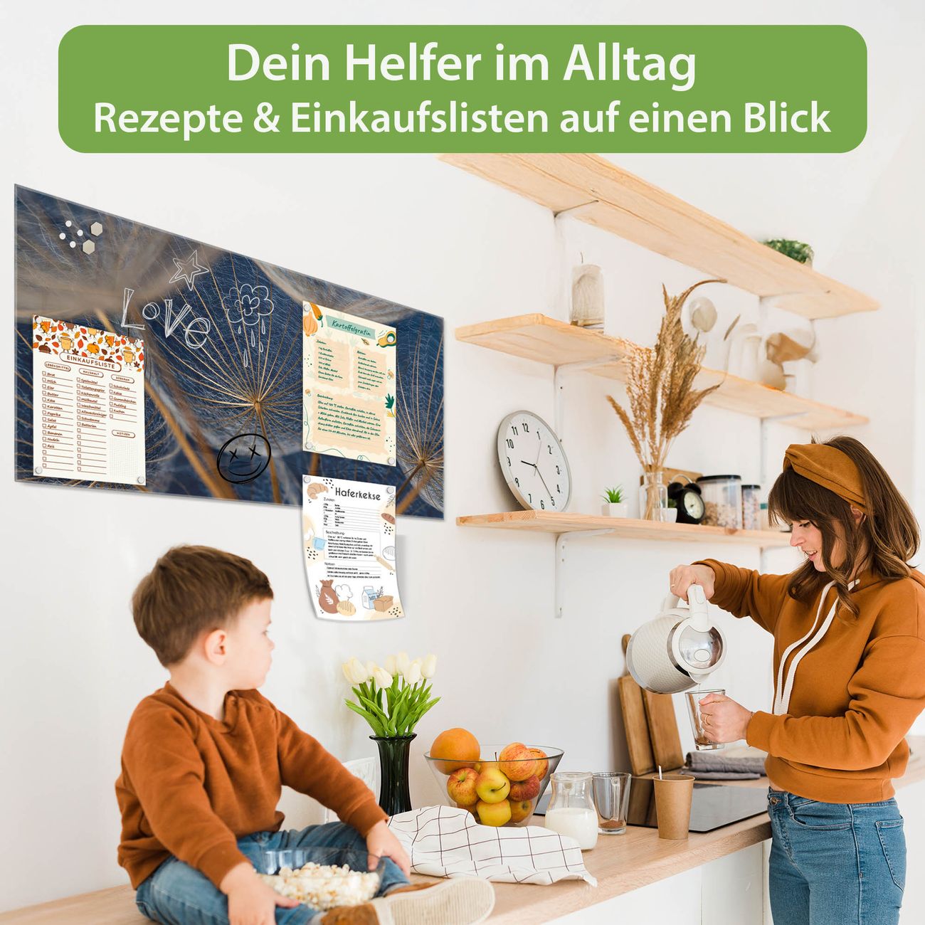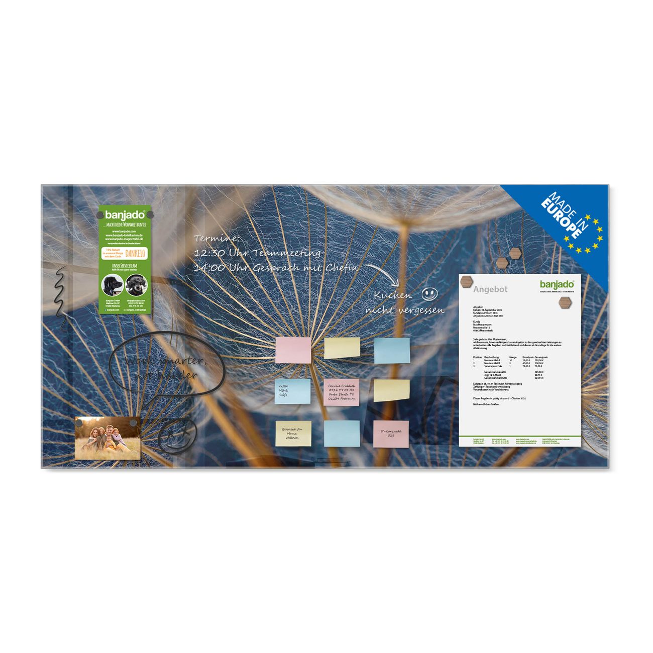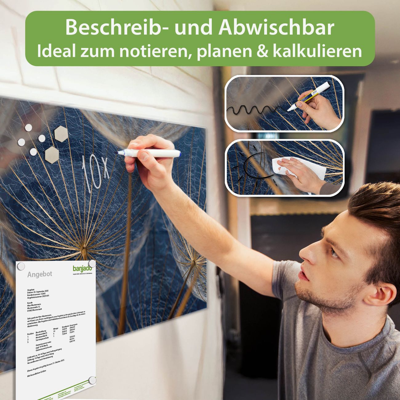 Material: 4mm Sicherheitsglas mit Metallrückwand Eigenschaften: beschreibbar, magnetisch, kratzfest Maße: 110x55x0,6cm, 9,08kg schwer Motiv Nummer 12783 Verblüht Zubehör: inklusive 4 Neodym-Magnete