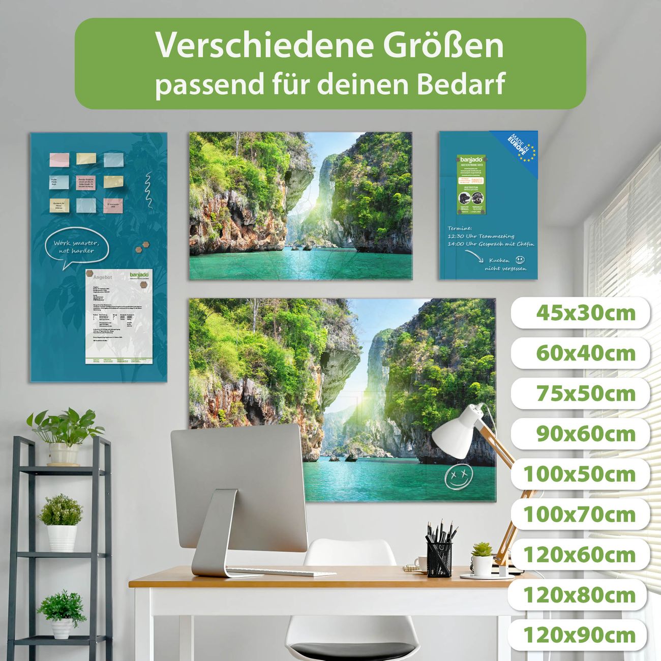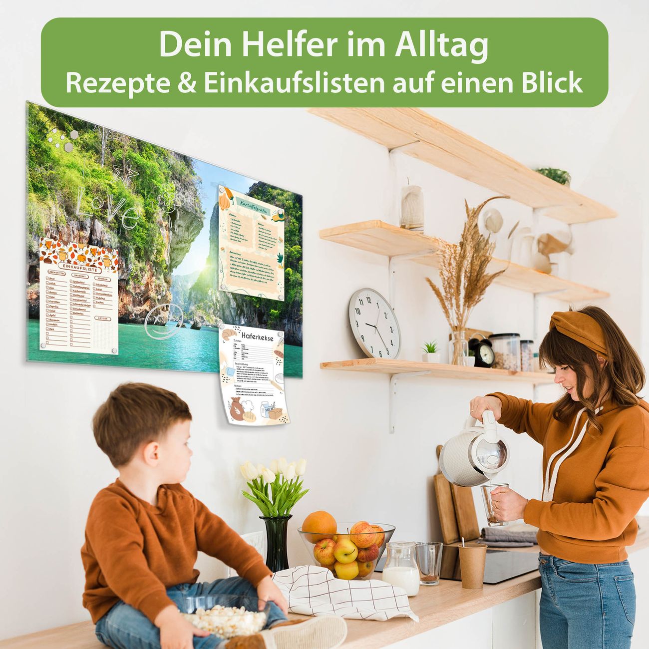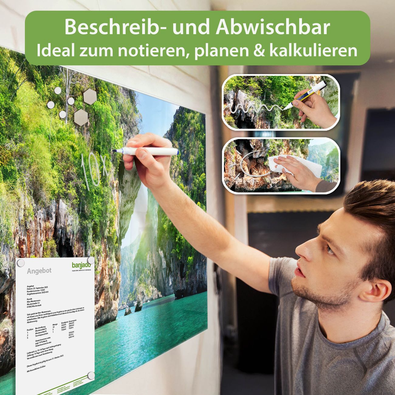 Material: 4mm Sicherheitsglas mit Metallrückwand Eigenschaften: beschreibbar, magnetisch, kratzfest Maße: 90x60x0,6cm, 8,10kg schwer Motiv Nummer 12266 Versteckte Bucht Zubehör: inklusive 4 Neodym-Magnete