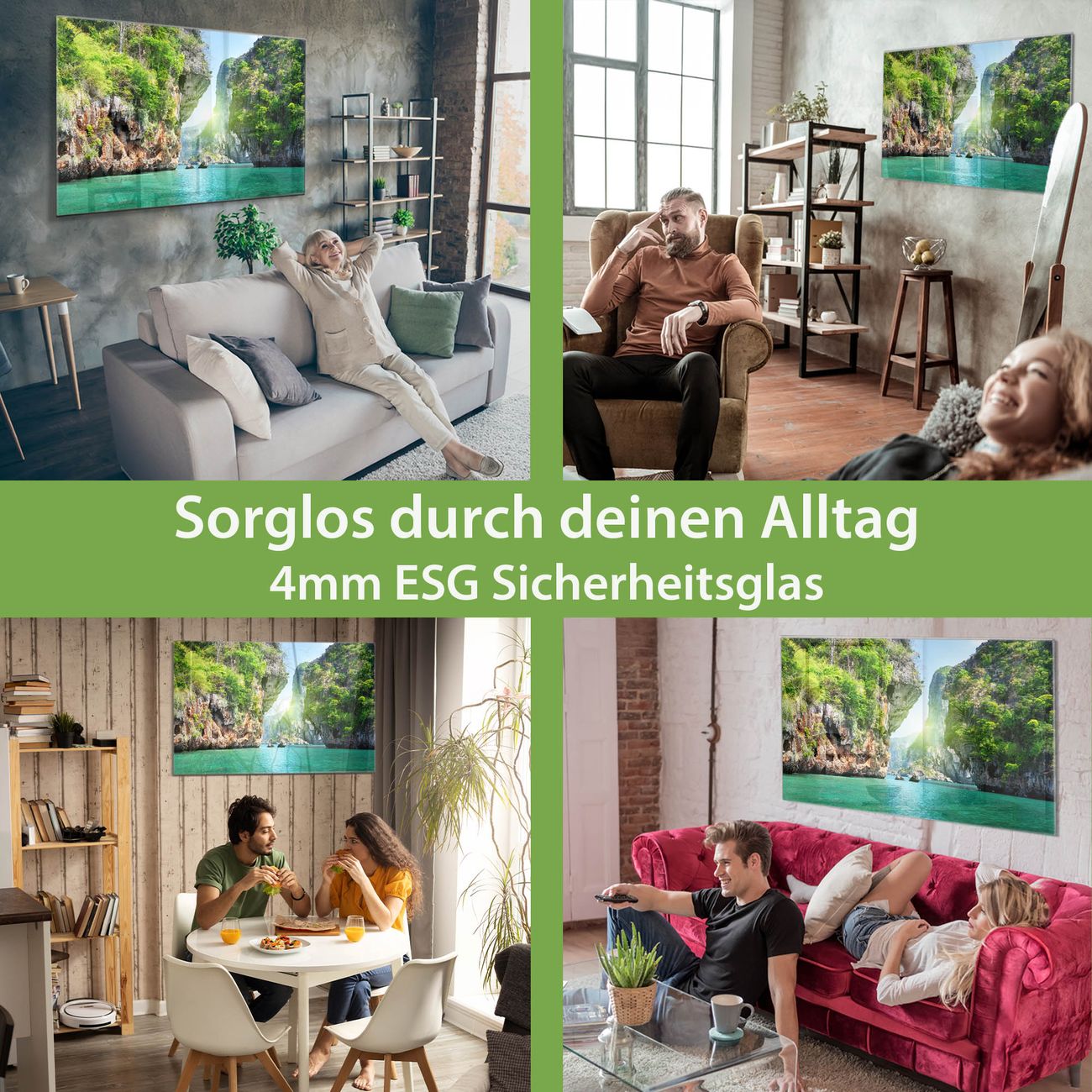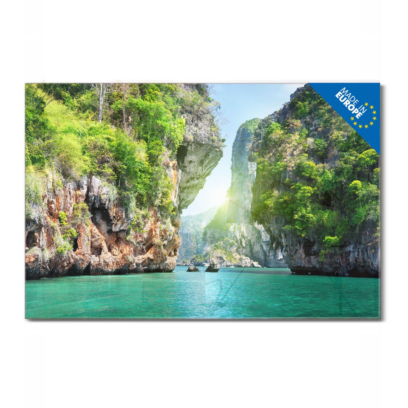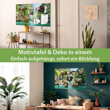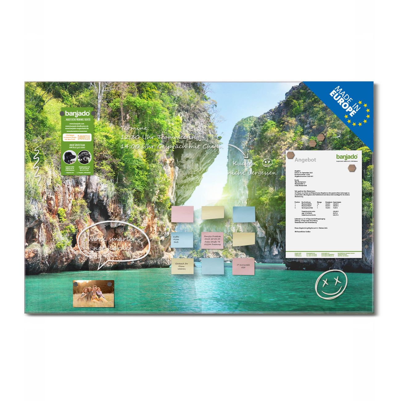 Material: 4mm Sicherheitsglas mit Metallrückwand Eigenschaften: beschreibbar, magnetisch, kratzfest Maße: 90x60x0,6cm, 8,10kg schwer Motiv Nummer 12266 Versteckte Bucht Zubehör: inklusive 4 Neodym-Magnete