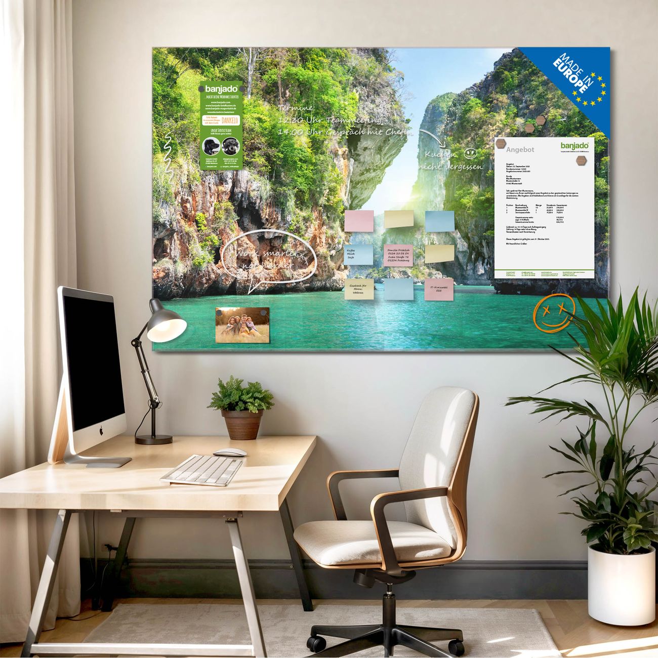 Die banjado Glas Magnettafel mit dem Motiv Motiv Versteckte Bucht verbindet Funktionalität mit Stil. Sie ersetzt das Zettelchaos durch klare Strukturen und bringt dabei eine warme, natürliche Atmosphäre in Ihr Zuhause. Ob im Büro, in der Küche oder im Eingangsbereich - dieses Design-Board zieht Blicke an und sorgt für Ordnung mit Charakter.