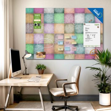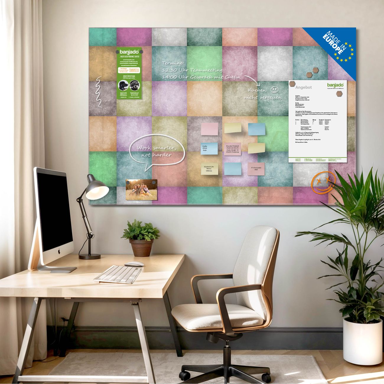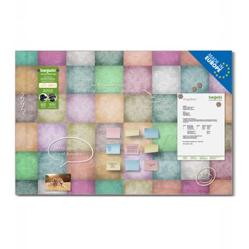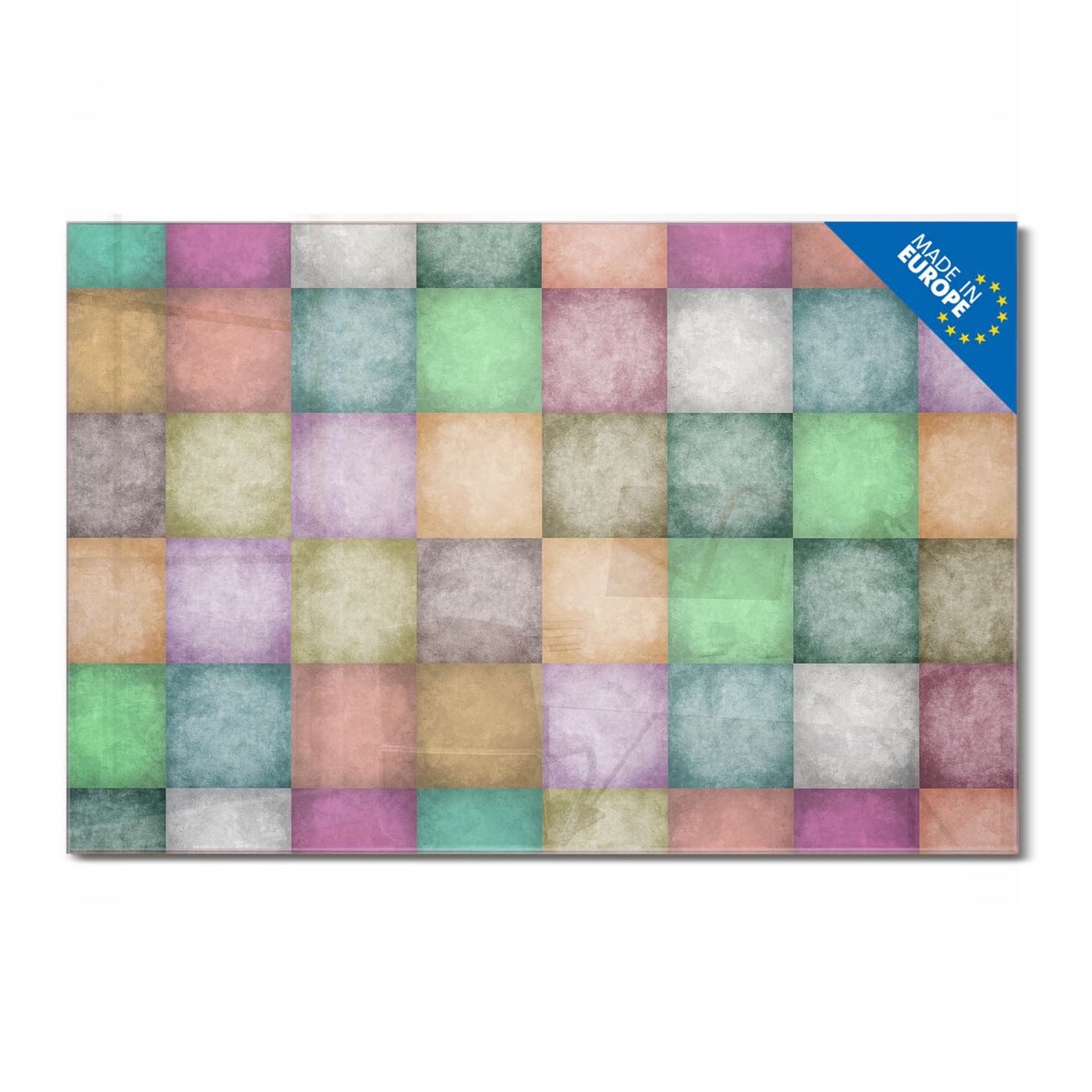 Material: 4mm Sicherheitsglas mit Metallrückwand Eigenschaften: beschreibbar, magnetisch, kratzfest Maße: 90x60x0,6cm, 8,10kg schwer Motiv Nummer 11100 Verwaschene Quadrate Zubehör: inklusive 4 Neodym-Magnete