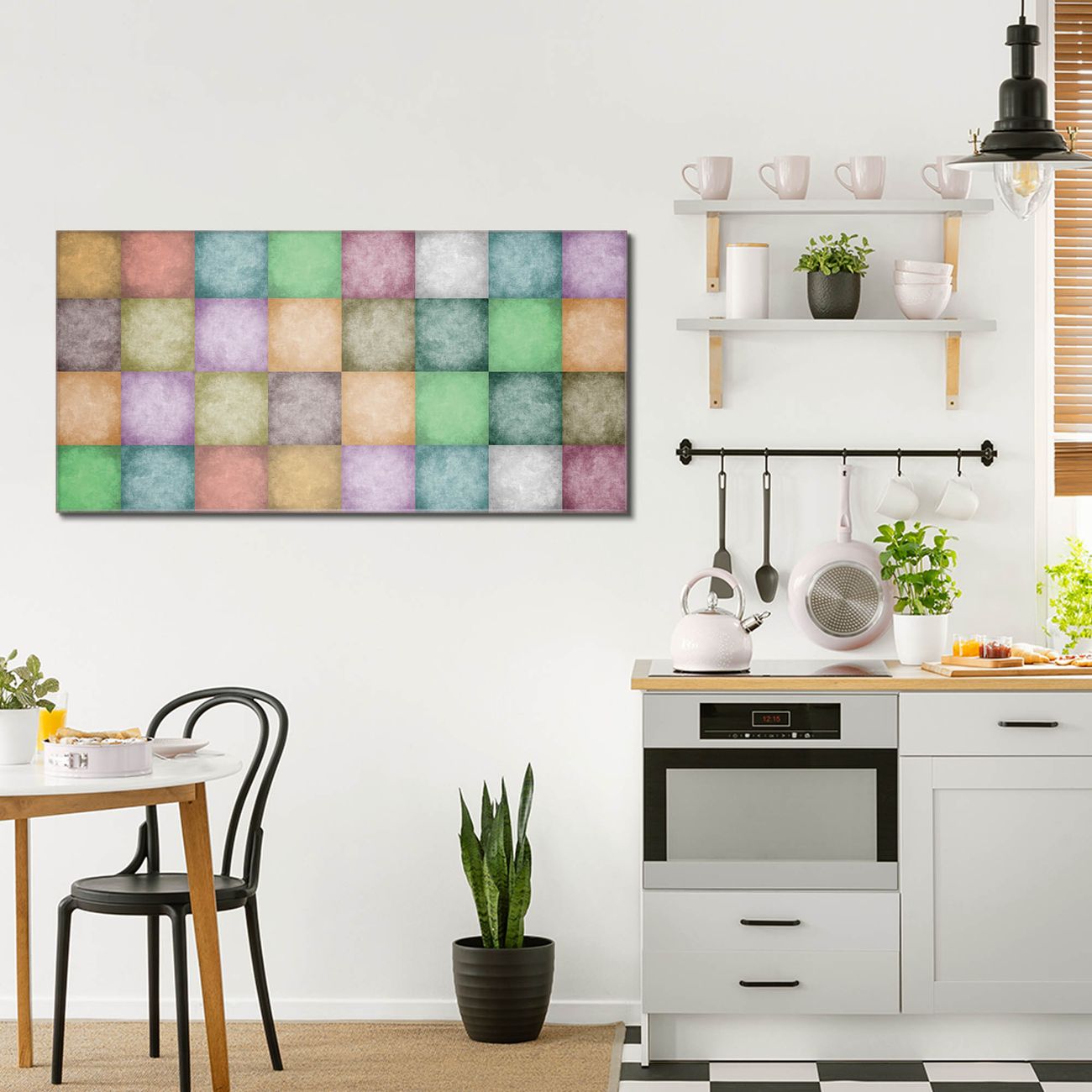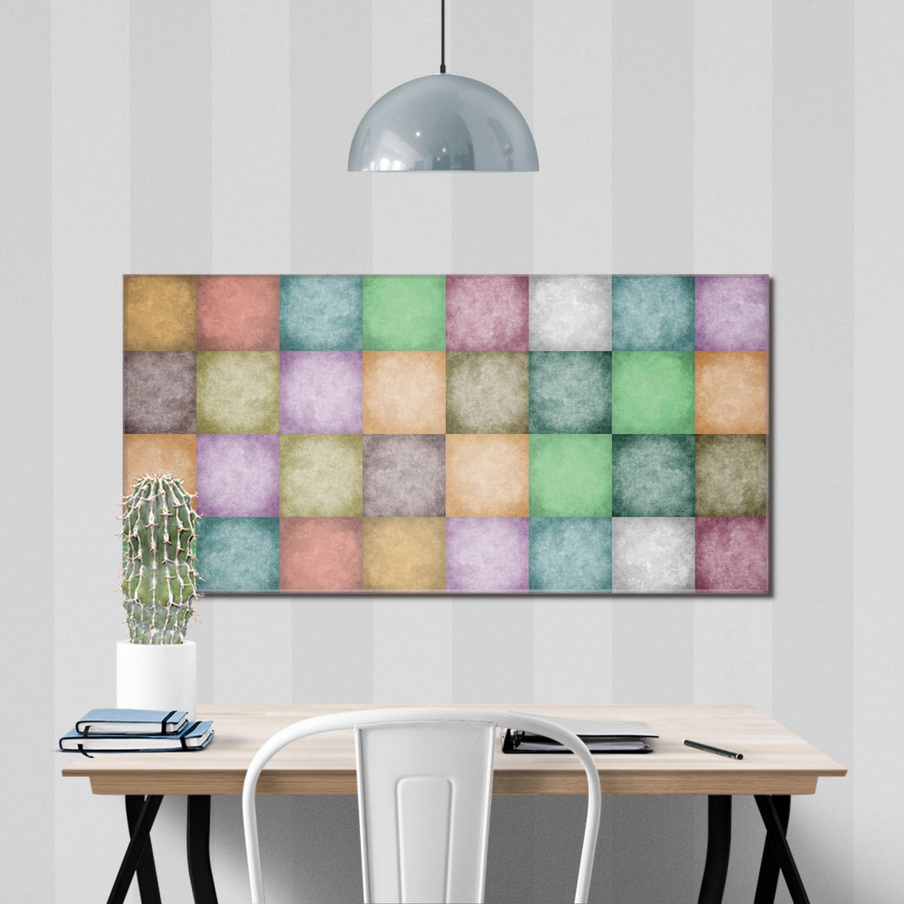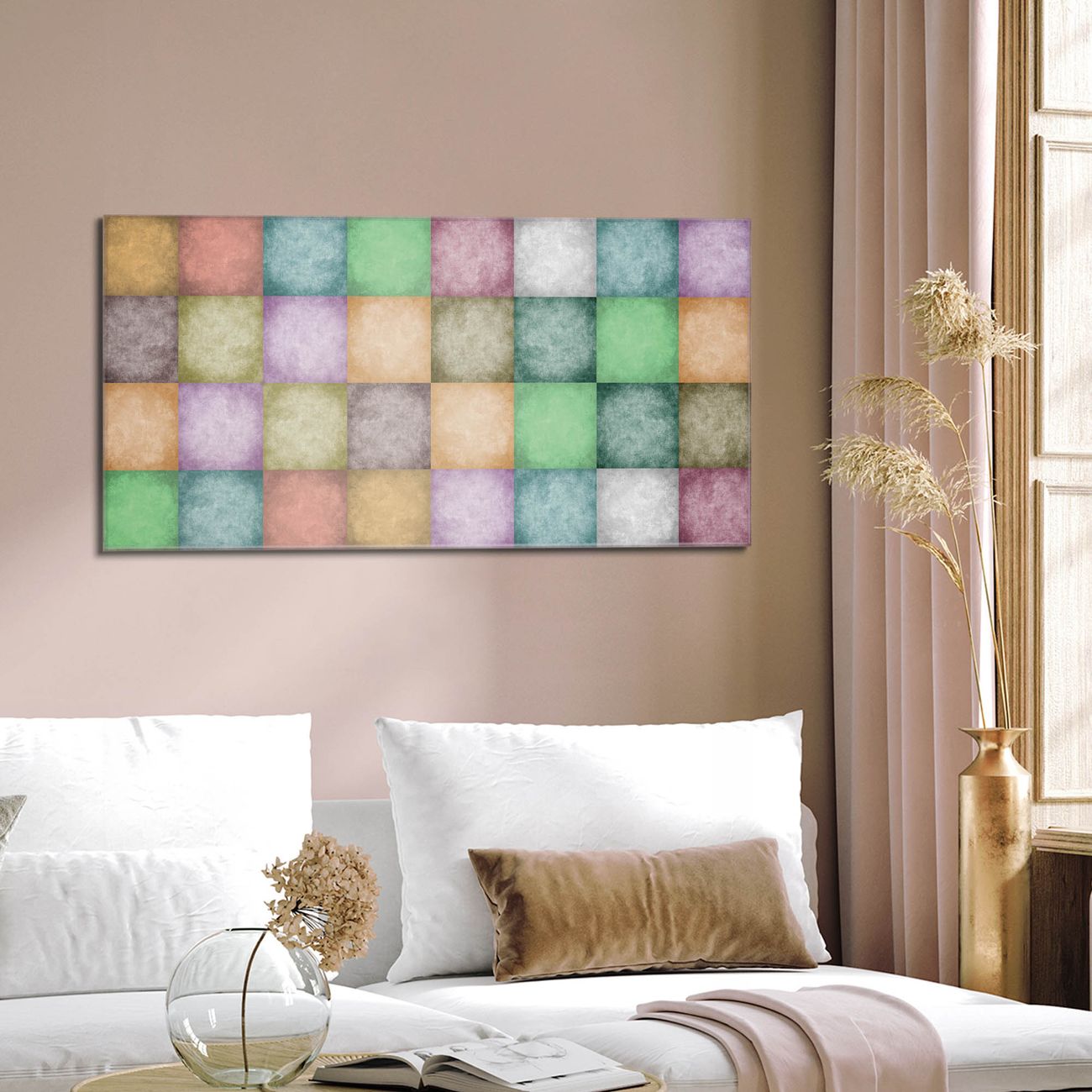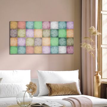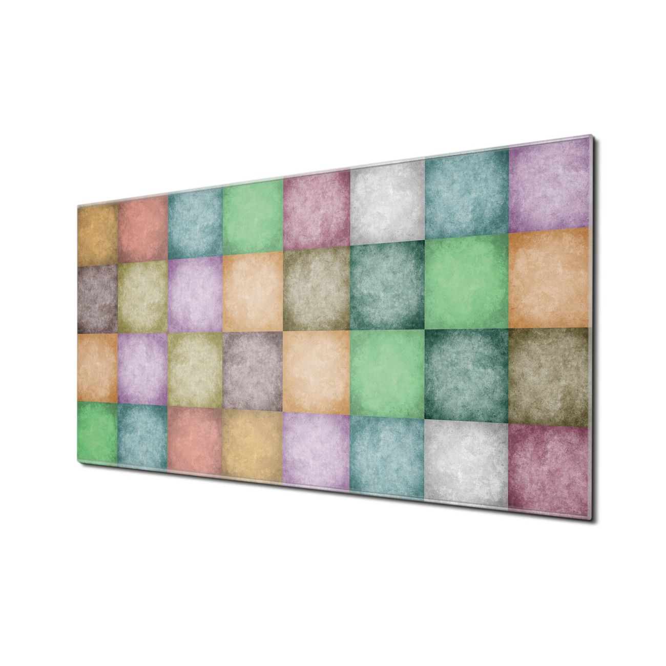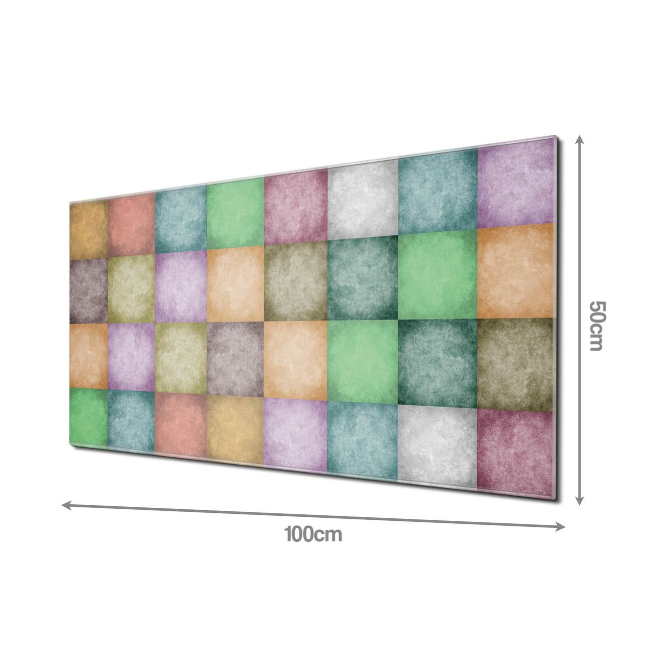 Material: 4mm Sicherheitsglas mit Metallrückwand Eigenschaften: beschreibbar, magnetisch, kratzfest Maße: 100x50x0,6cm, 7,50kg schwer Motiv Nummer 11100 Verwaschene Quadrate Zubehör: inklusive 4 Neodym-Magnete