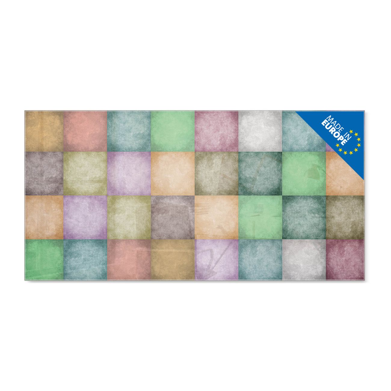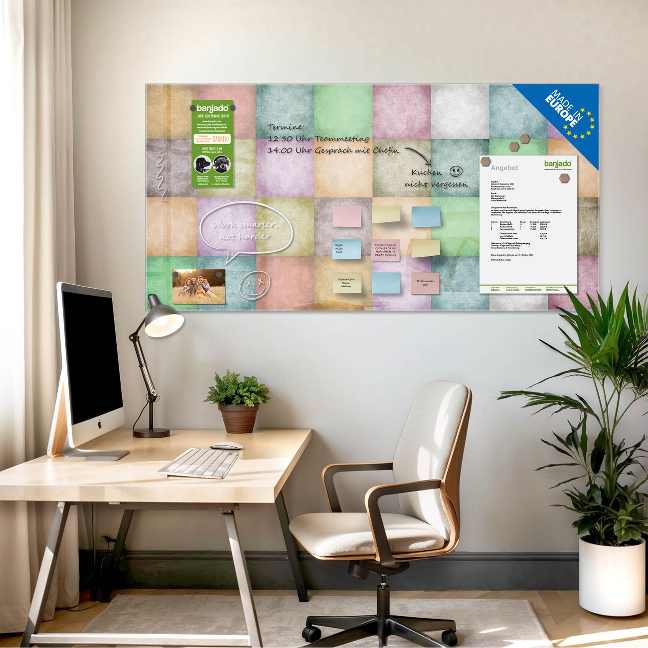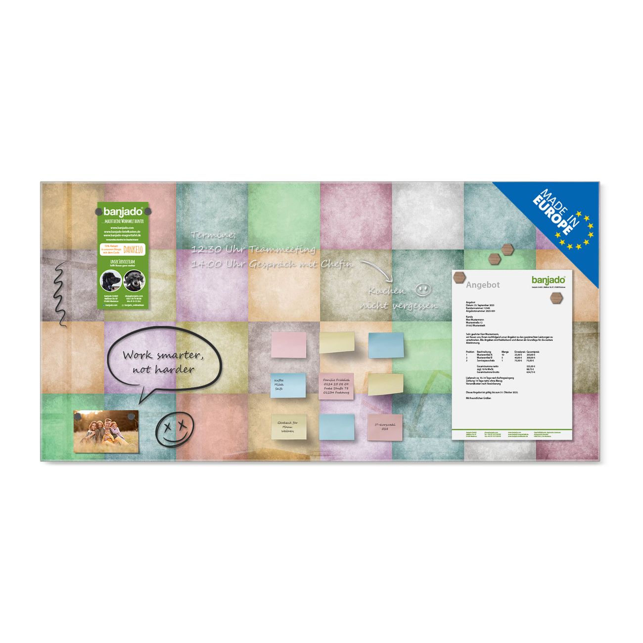Material: 4mm Sicherheitsglas mit Metallrückwand Eigenschaften: beschreibbar, magnetisch, kratzfest Maße: 120x60x0,6cm, 10,80kg schwer Motiv Nummer 11100 Verwaschene Quadrate Zubehör: inklusive 4 Neodym-Magnete