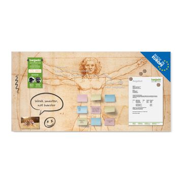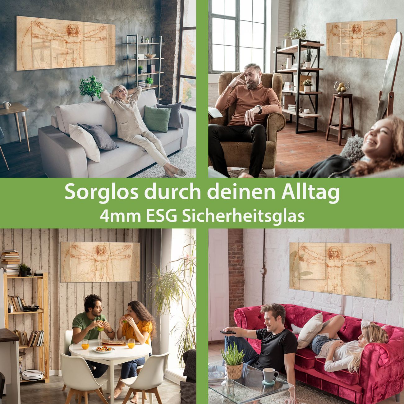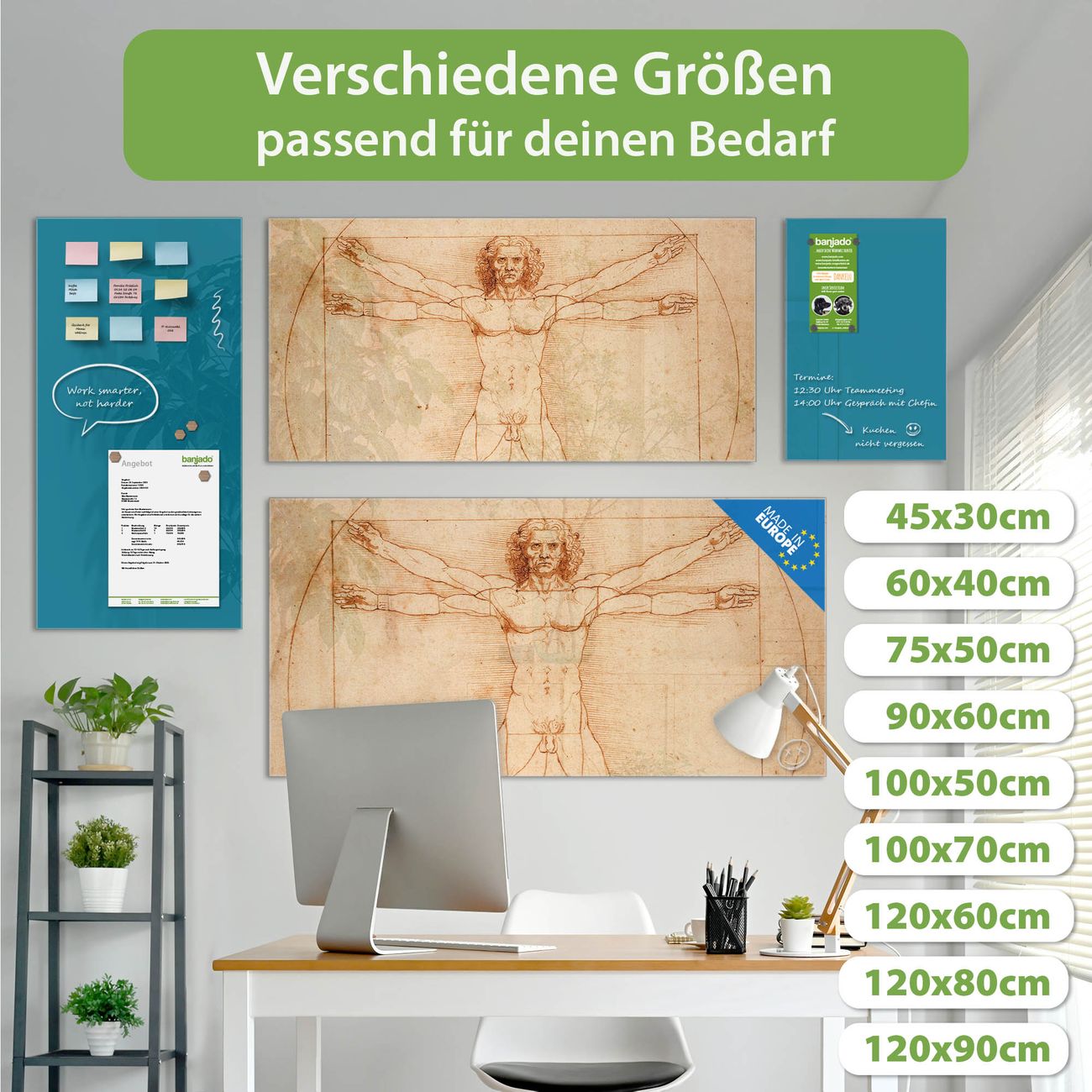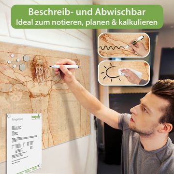 Material: 4mm Sicherheitsglas mit Metallrückwand Eigenschaften: beschreibbar, magnetisch, kratzfest Maße: 100x50x0,6cm, 7,50kg schwer Motiv Nummer 10621 Vitruvianische Figur Zubehör: inklusive 4 Neodym-Magnete