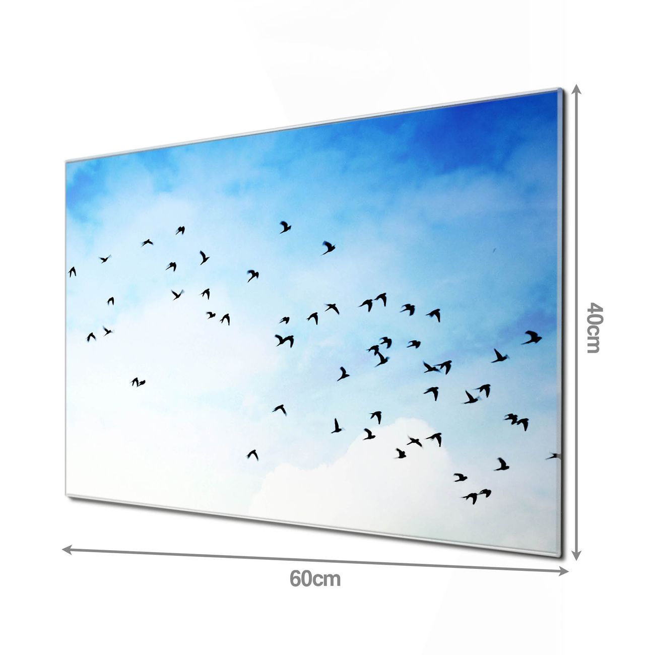 Material: 4mm Sicherheitsglas mit Metallrückwand Eigenschaften: beschreibbar, magnetisch, kratzfest Maße: 60x40x0,6cm, 3,6kg schwer Motiv Nummer 12847 Vögel am Himmel 2 Zubehör: inklusive 4 Neodym-Magnete