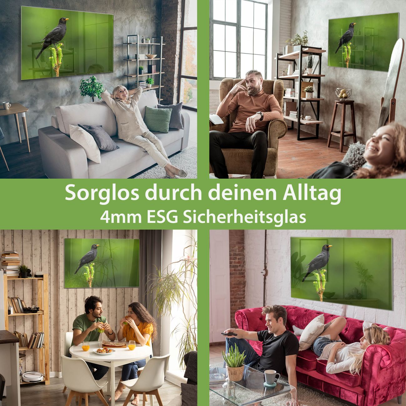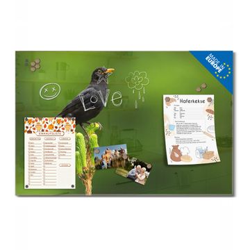 Material: 4mm Sicherheitsglas mit Metallrückwand Eigenschaften: beschreibbar, magnetisch, kratzfest Maße: 75x50x0,6cm, 5,63kg schwer Motiv Nummer 12974 Vogel auf Tannenzweig Zubehör: inklusive 4 Neodym-Magnete