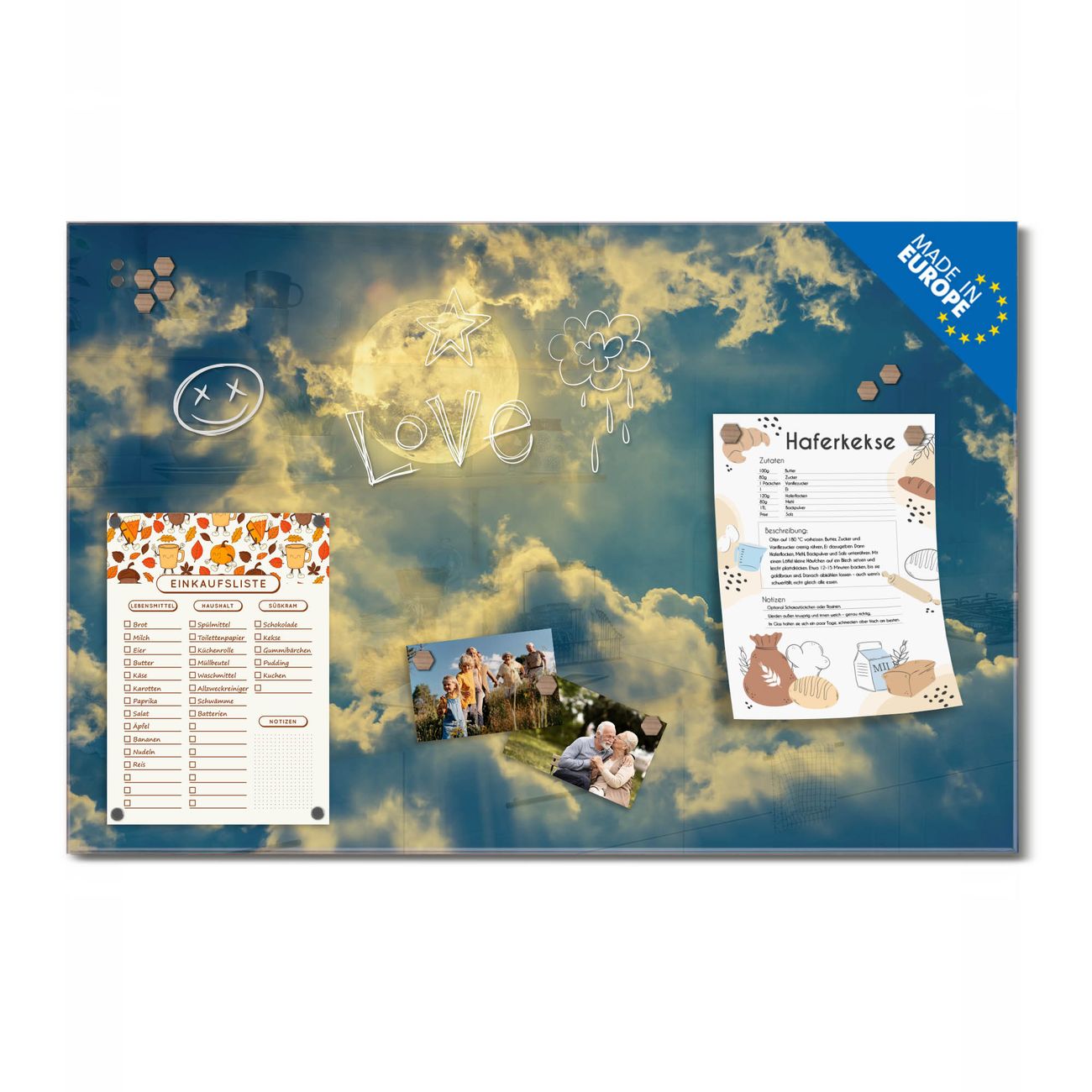 Material: 4mm Sicherheitsglas mit Metallrückwand Eigenschaften: beschreibbar, magnetisch, kratzfest Maße: 75x50x0,6cm, 5,63kg schwer Motiv Nummer 12850 Vollmond 2 Zubehör: inklusive 4 Neodym-Magnete