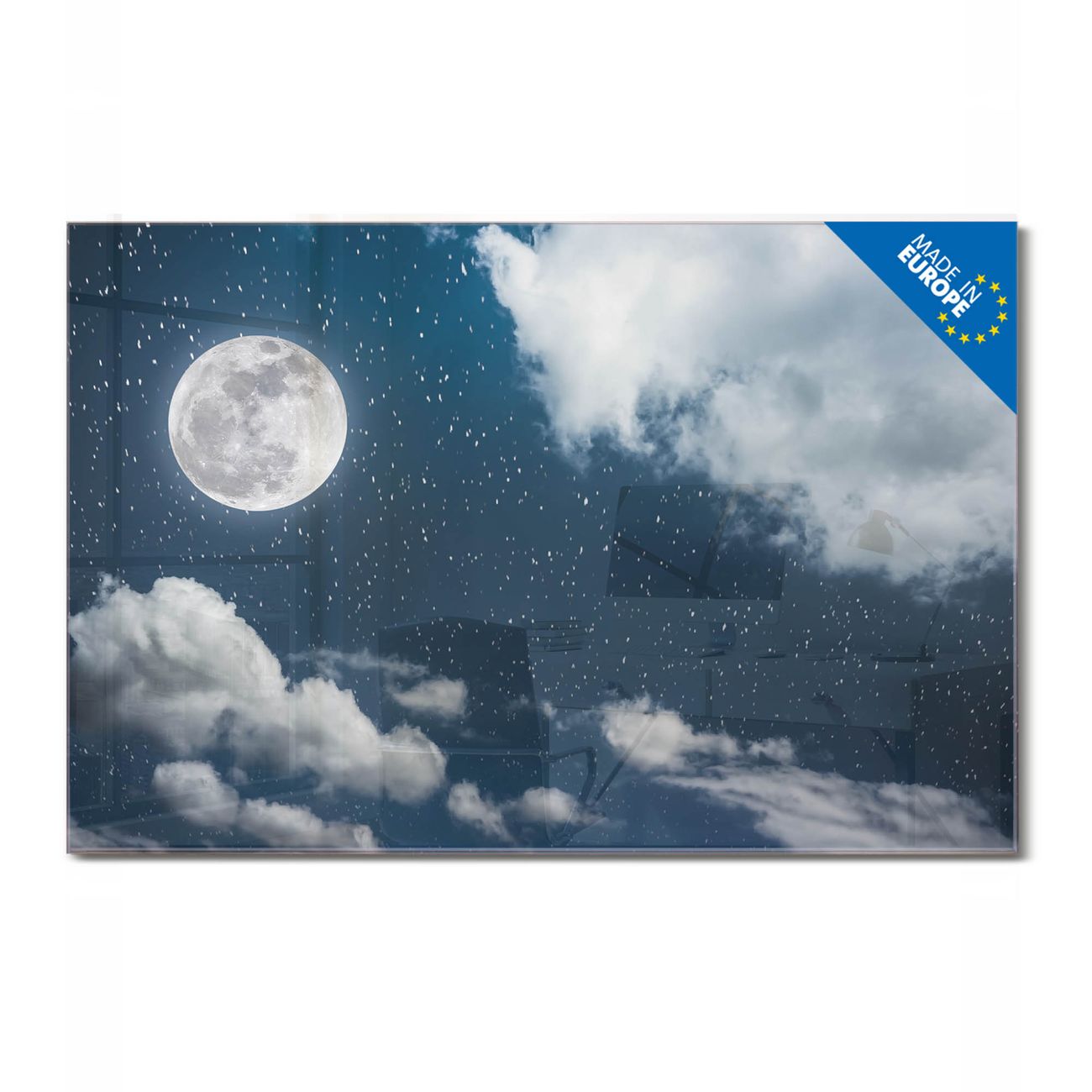 Material: 4mm Sicherheitsglas mit Metallrückwand Eigenschaften: beschreibbar, magnetisch, kratzfest Maße: 45x30x0,6cm, 2,03kg schwer Motiv Nummer 12851 Vollmond 3 Zubehör: inklusive 4 Neodym-Magnete