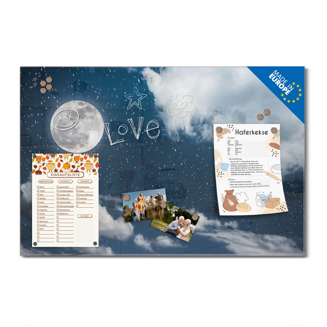 Ein Stück Design, das Ihren Alltag organisiert. Schreiben, heften, inspirieren - alles an einem Ort. Qualität, die man spürt. Montage leicht gemacht. Handwerk mit Herz - veredelt in Sachsen. Einzigartiges Design mit Motiv Motiv Vollmond 3 Beschreibbare Glasoberfläche, leicht zu reinigen Starke Magnetkraft durch Stahlrückwand Inklusive 4 Neodym-Magneten Flexible Montageoptionen Handveredelt in Sachsen - Qualität, die bleibt