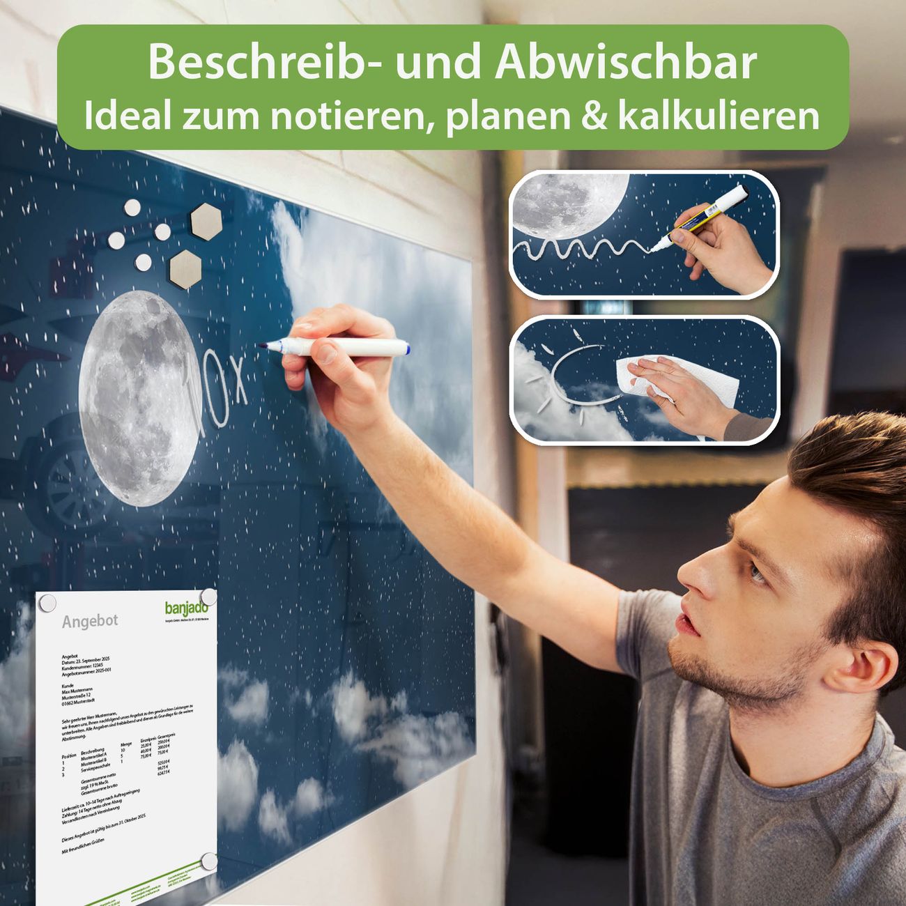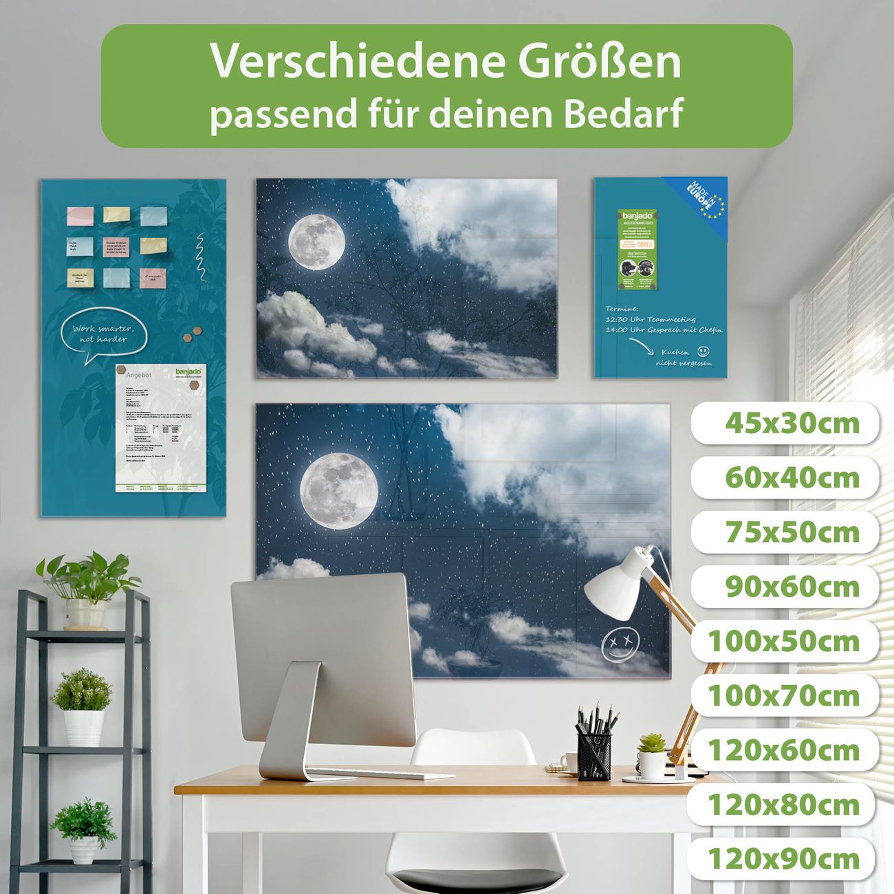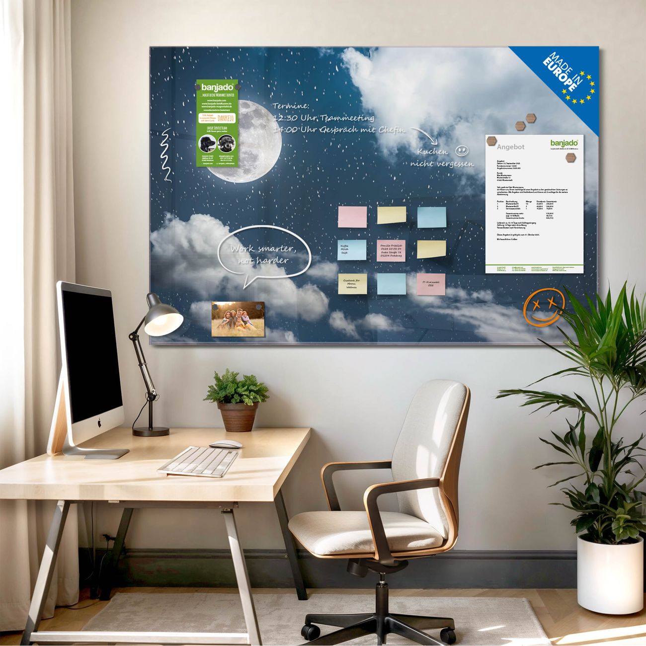 Jede Glas Magnettafel wird in unserer Werkstatt von Hand gefertigt und sorgfältig geprüft. So erhalten Sie ein echtes Qualitätsprodukt, das Funktion und Ästhetik perfekt vereint.?? Warum banjado?