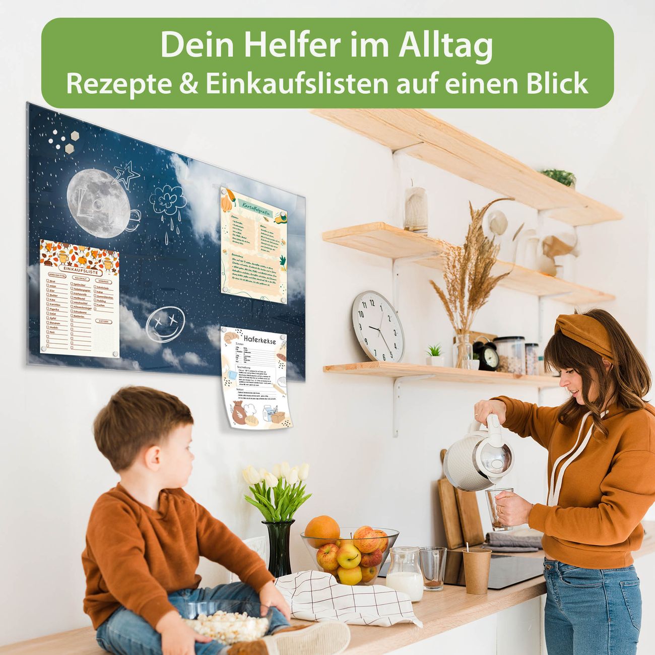 Auf der glatten Glasoberfläche lassen sich Termine, Rezepte oder Notizen ganz einfach mit Kreidestiften festhalten und rückstandslos entfernen. Starke Neodym-Magnete halten Ihre wichtigsten Erinnerungen sicher an Ort und Stelle. So entsteht Ihre ganz persönliche Ideenwand - jeden Tag neu.