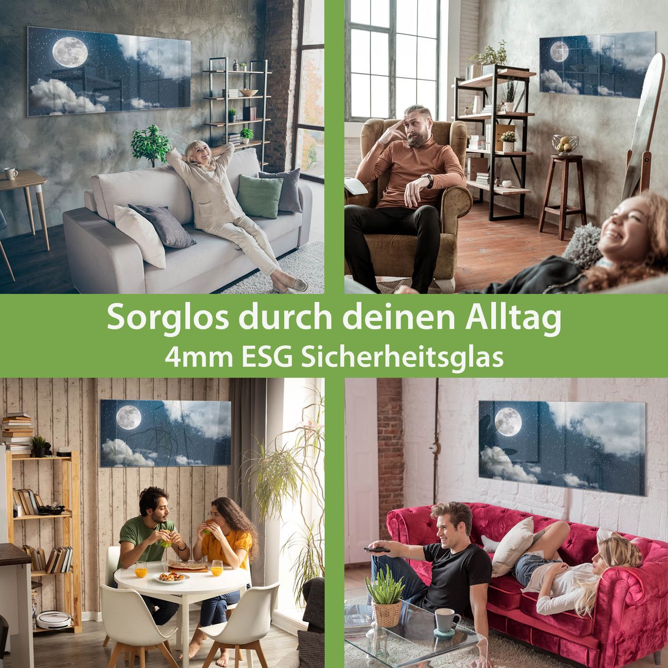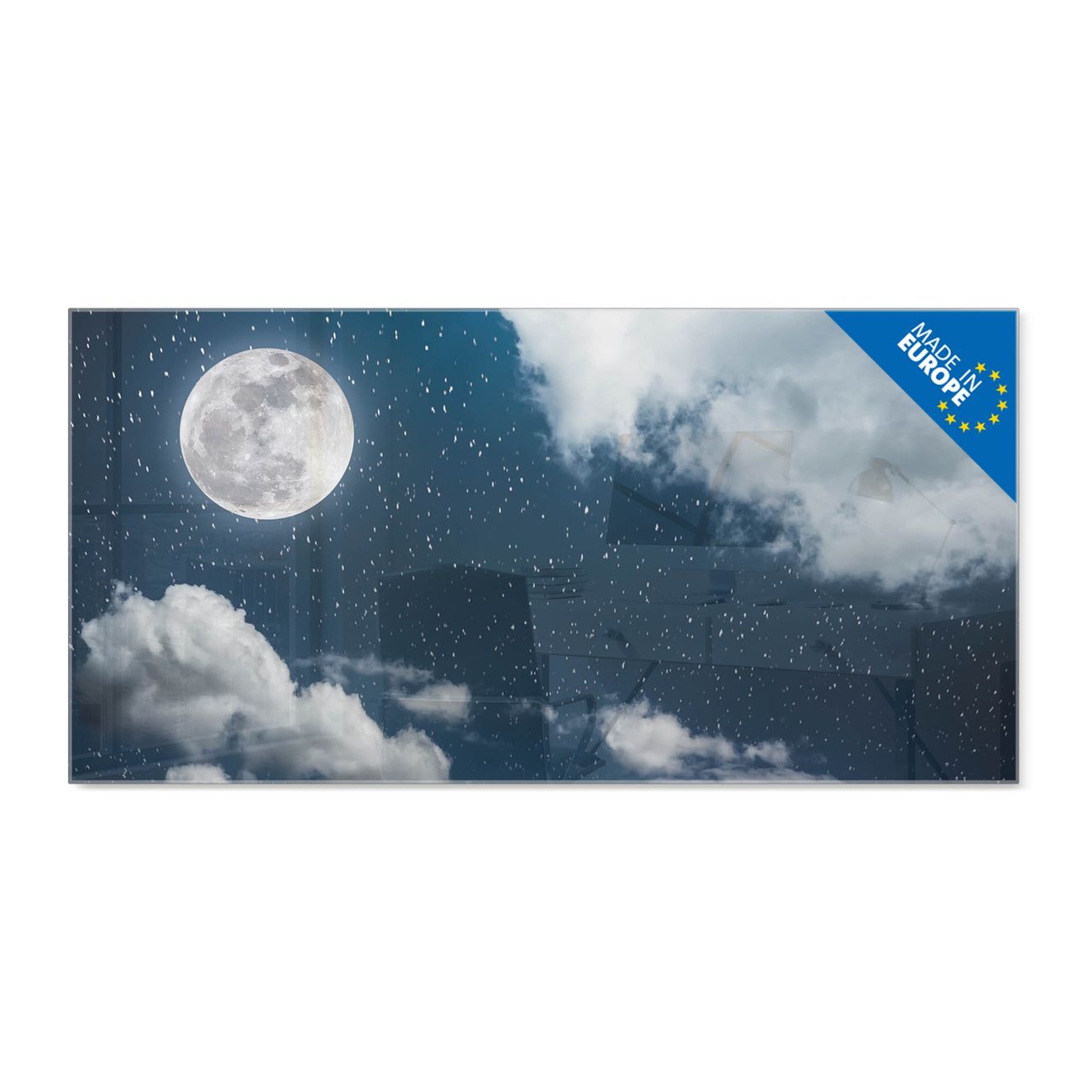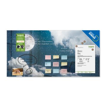 Material: 4mm Sicherheitsglas mit Metallrückwand Eigenschaften: beschreibbar, magnetisch, kratzfest Maße: 100x50x0,6cm, 7,50kg schwer Motiv Nummer 12851 Vollmond 3 Zubehör: inklusive 4 Neodym-Magnete