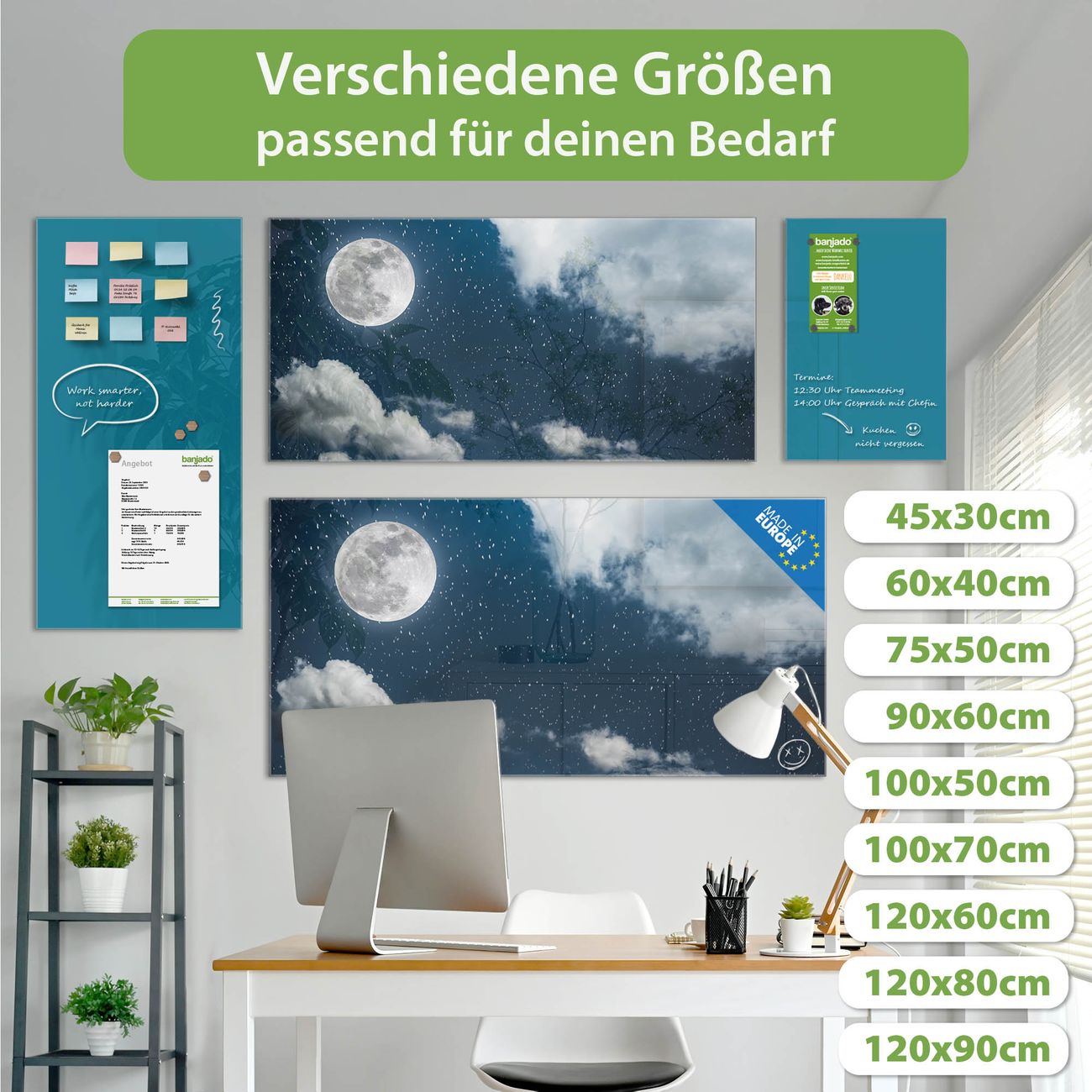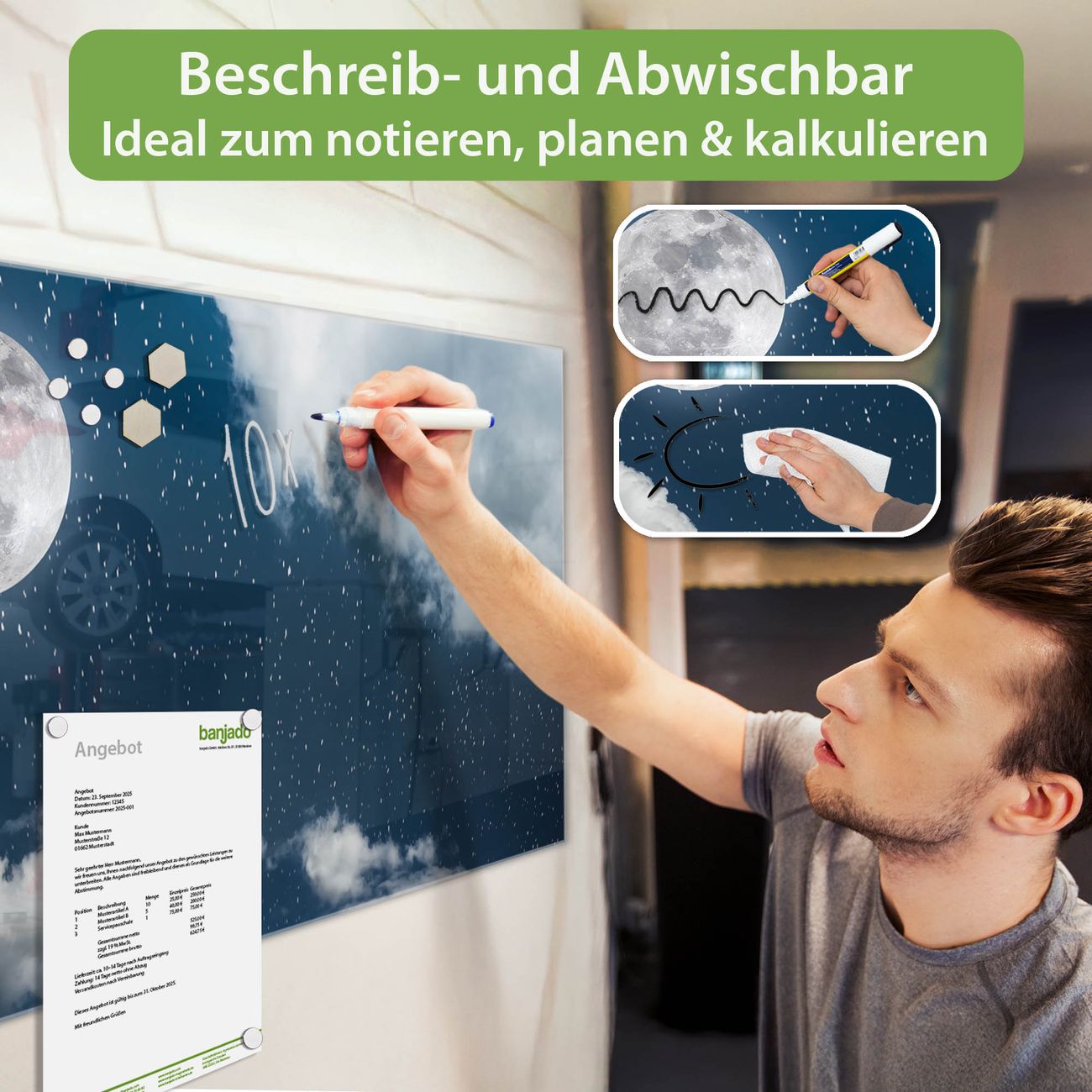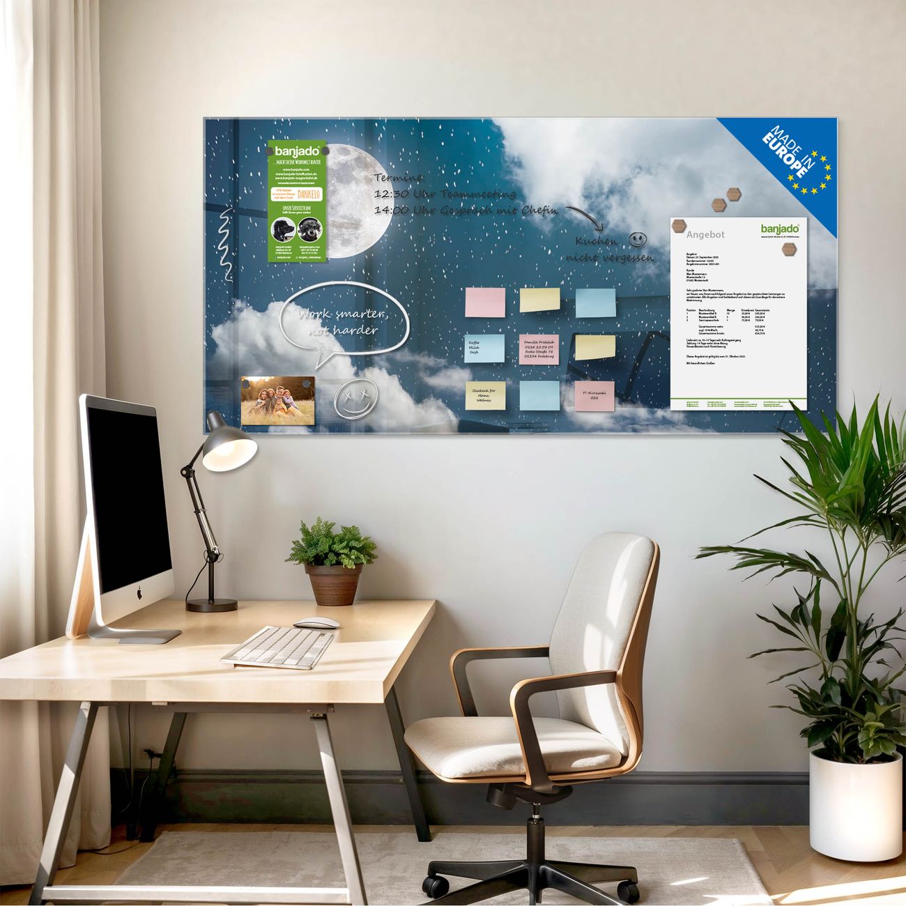 Jede Glas Magnettafel wird in unserer Werkstatt von Hand gefertigt und sorgfältig geprüft. So erhalten Sie ein echtes Qualitätsprodukt, das Funktion und Ästhetik perfekt vereint.?? Warum banjado?