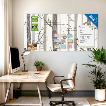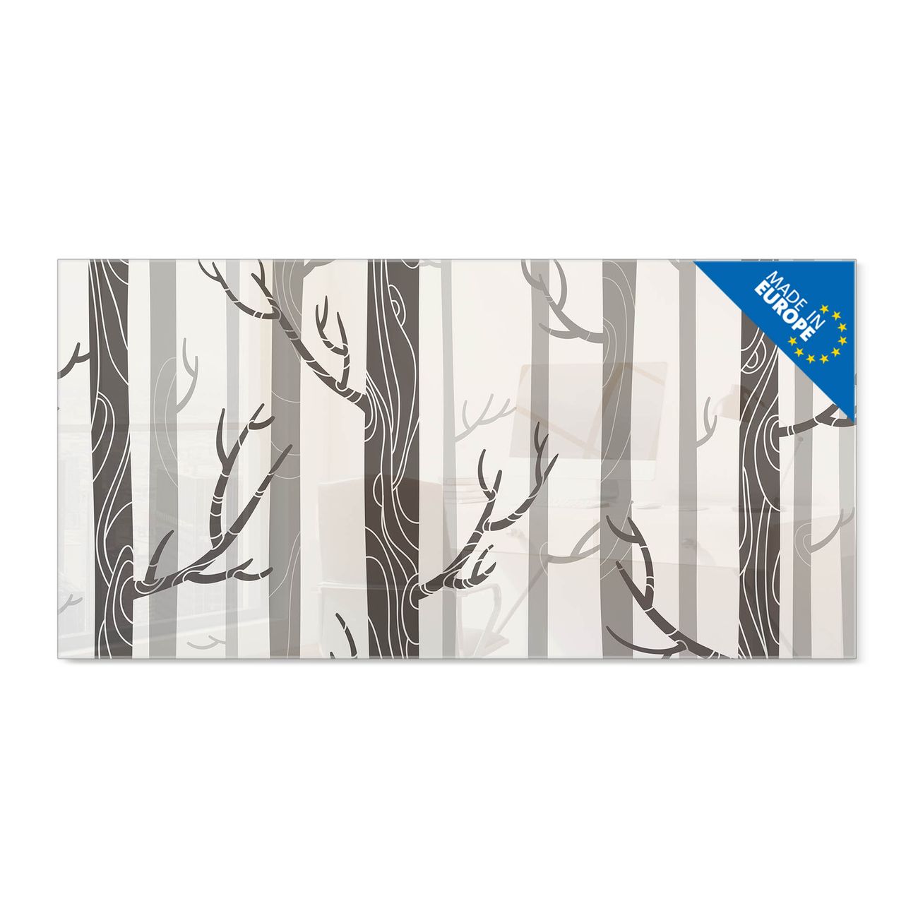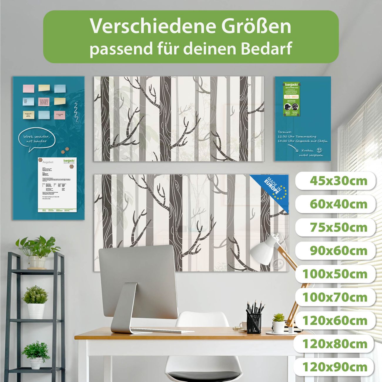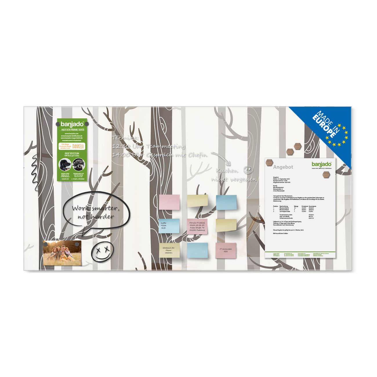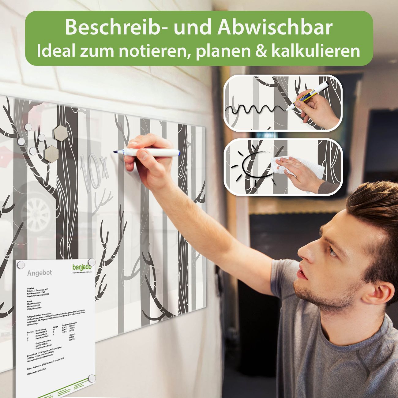 Material: 4mm Sicherheitsglas mit Metallrückwand Eigenschaften: beschreibbar, magnetisch, kratzfest Maße: 120x60x0,6cm, 10,80kg schwer Motiv Nummer 12954 Wald Zubehör: inklusive 4 Neodym-Magnete