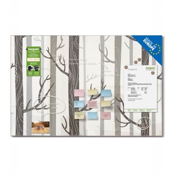 Material: 4mm Sicherheitsglas mit Metallrückwand Eigenschaften: beschreibbar, magnetisch, kratzfest Maße: 120x80x0,6cm, 14,40kg schwer Motiv Nummer 12954 Wald Zubehör: inklusive 4 Neodym-Magnete