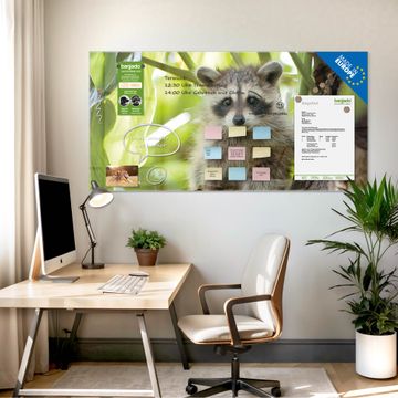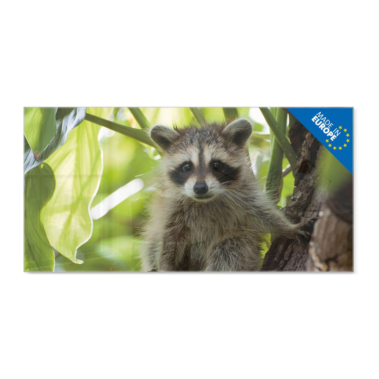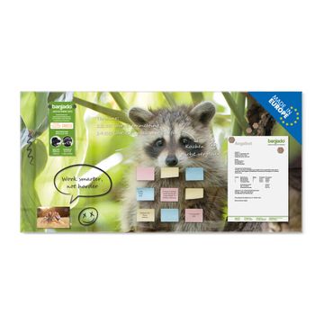 Material: 4mm Sicherheitsglas mit Metallrückwand Eigenschaften: beschreibbar, magnetisch, kratzfest Maße: 100x50x0,6cm, 7,50kg schwer Motiv Nummer 10424 Waschbär Zubehör: inklusive 4 Neodym-Magnete