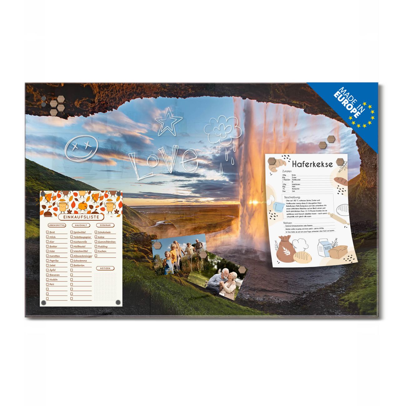 Ein Stück Design, das Ihren Alltag organisiert. Schreiben, heften, inspirieren - alles an einem Ort. Qualität, die man spürt. Montage leicht gemacht. Handwerk mit Herz - veredelt in Sachsen. Einzigartiges Design mit Motiv Motiv Wasserfall im Sonnenlicht Beschreibbare Glasoberfläche, leicht zu reinigen Starke Magnetkraft durch Stahlrückwand Inklusive 4 Neodym-Magneten Flexible Montageoptionen Handveredelt in Sachsen - Qualität, die bleibt