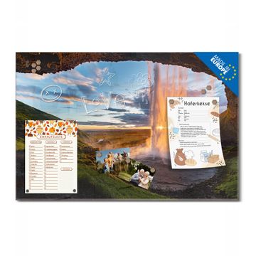 Material: 4mm Sicherheitsglas mit Metallrückwand Eigenschaften: beschreibbar, magnetisch, kratzfest Maße: 75x50x0,6cm, 5,63kg schwer Motiv Nummer 12987 Wasserfall im Sonnenlicht Zubehör: inklusive 4 Neodym-Magnete