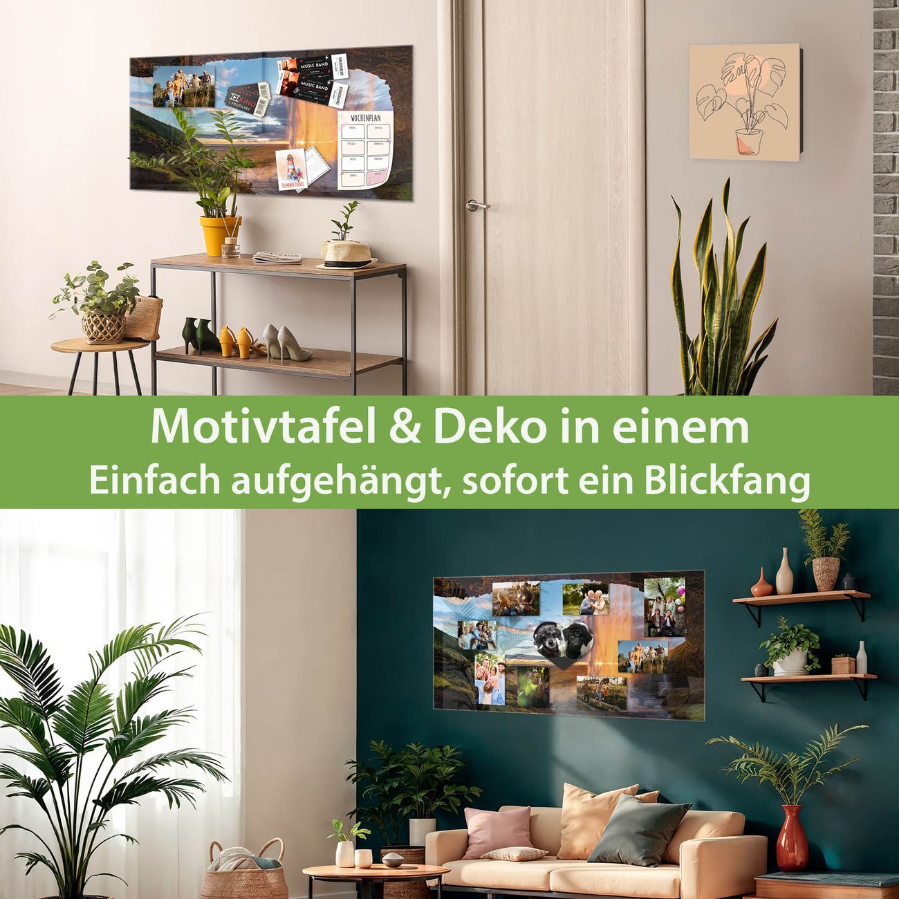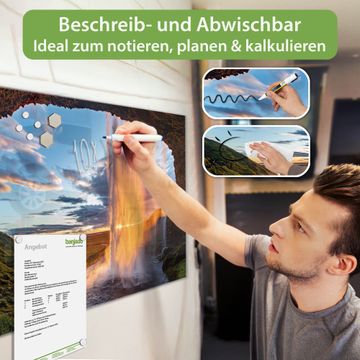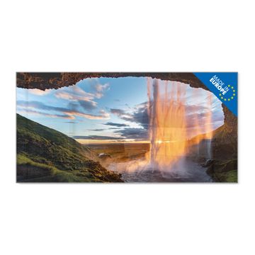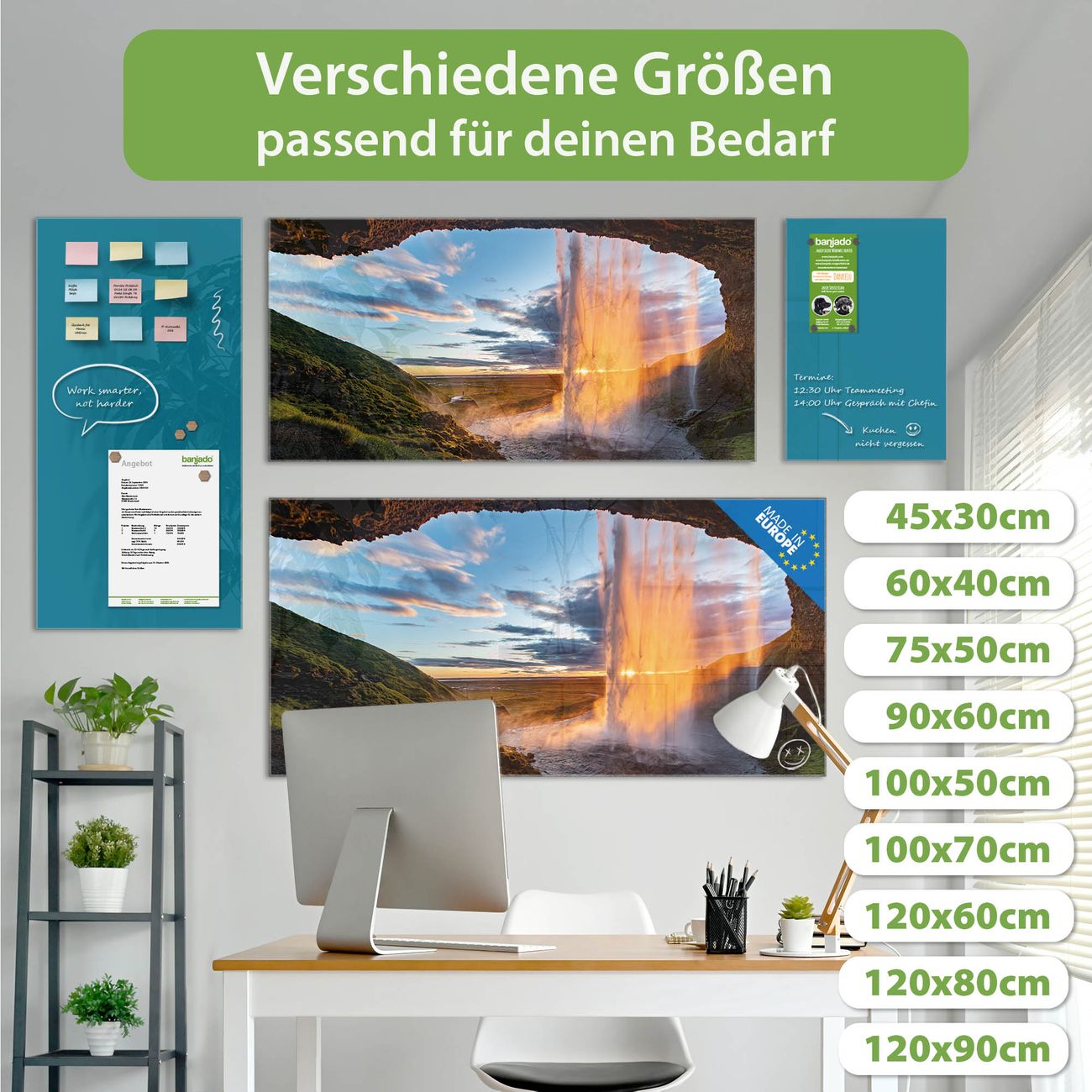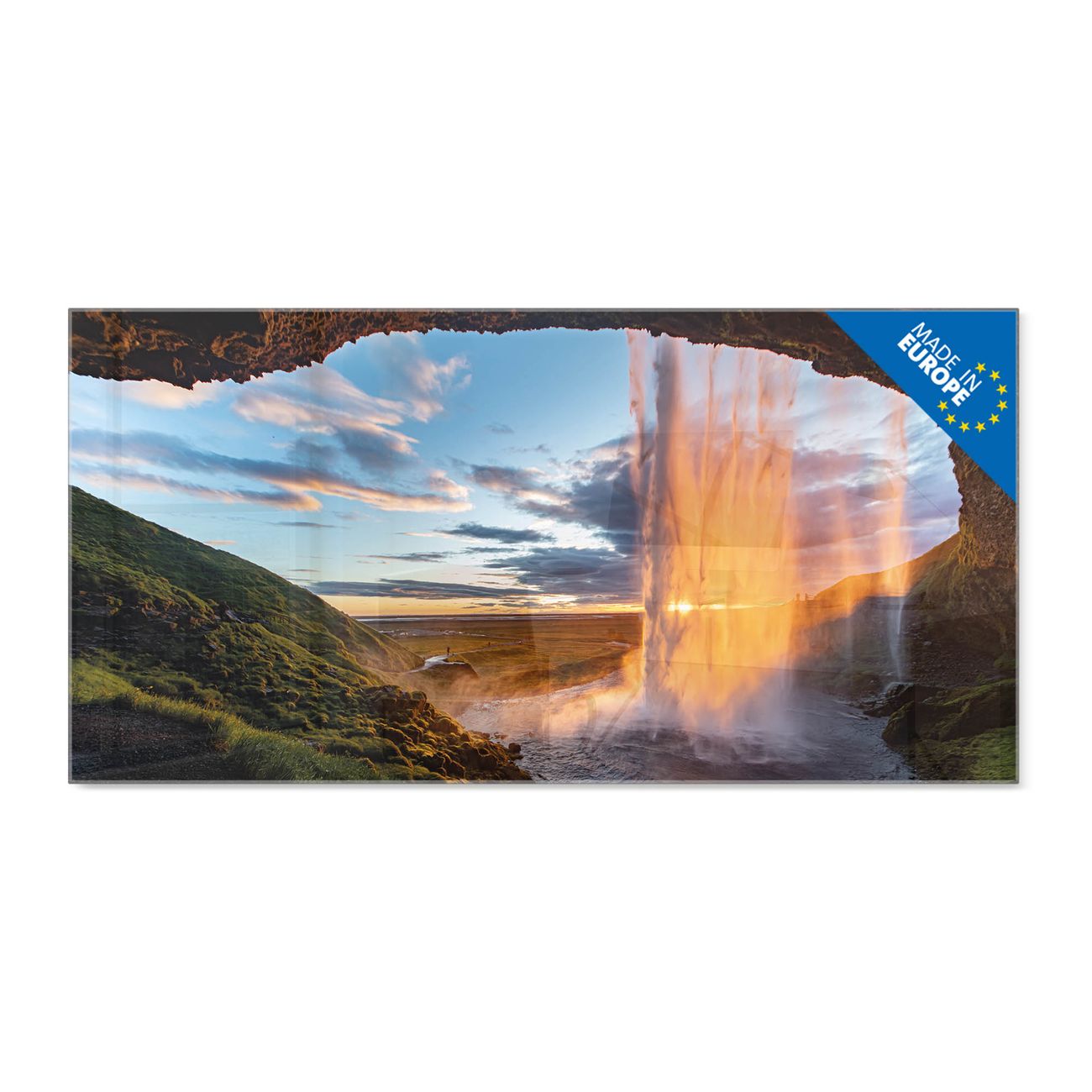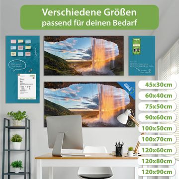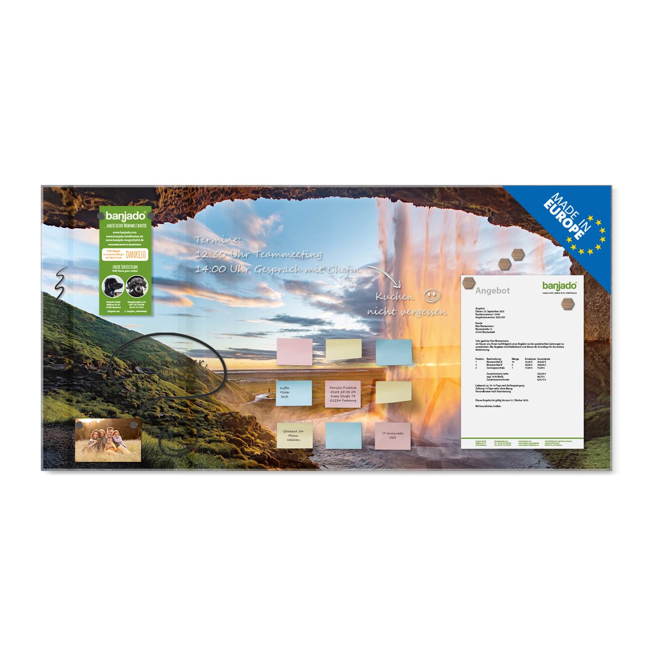 Material: 4mm Sicherheitsglas mit Metallrückwand Eigenschaften: beschreibbar, magnetisch, kratzfest Maße: 100x50x0,6cm, 7,50kg schwer Motiv Nummer 12987 Wasserfall im Sonnenlicht Zubehör: inklusive 4 Neodym-Magnete