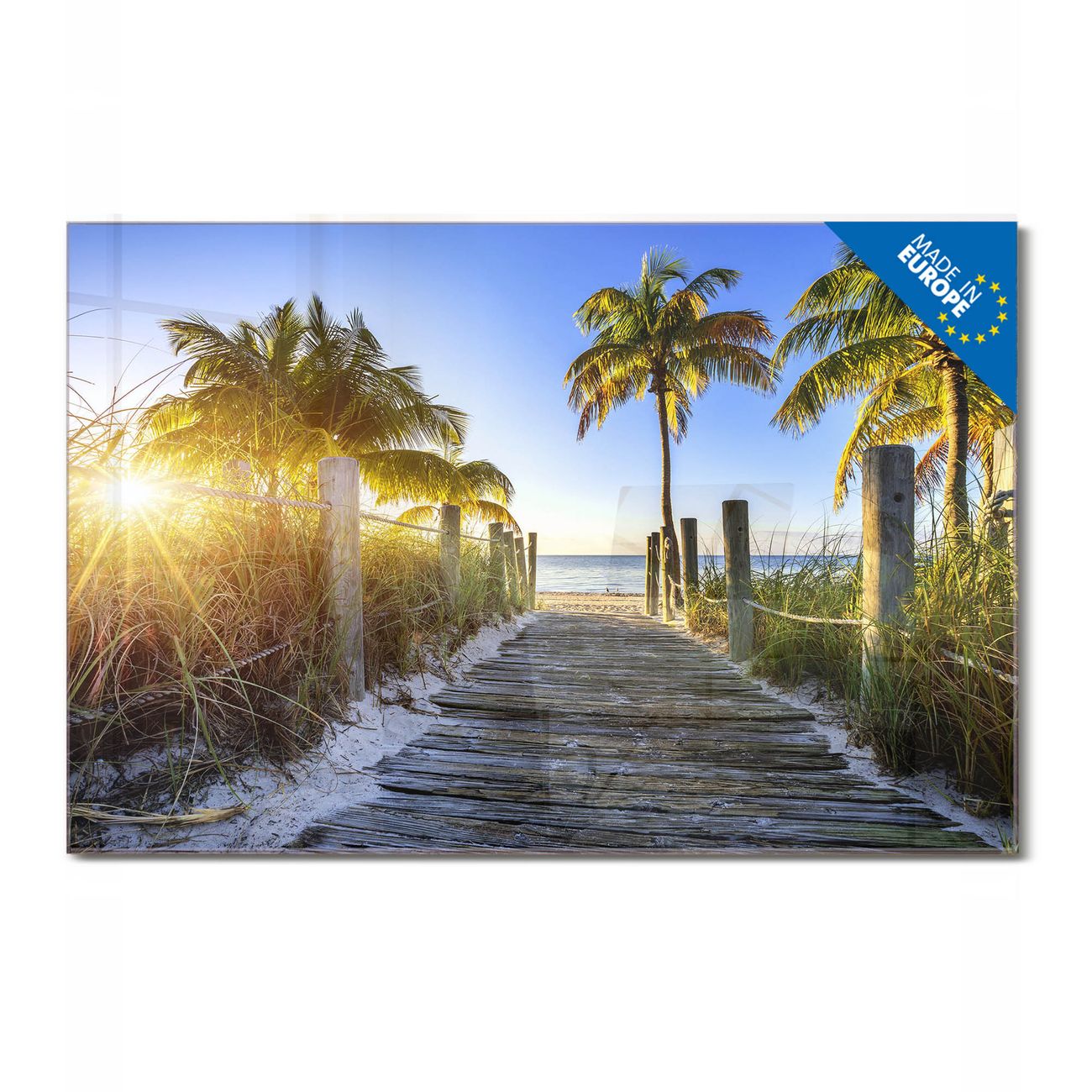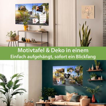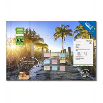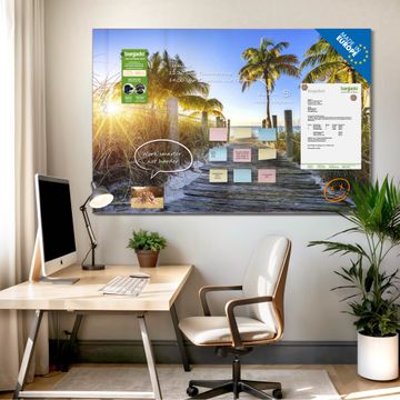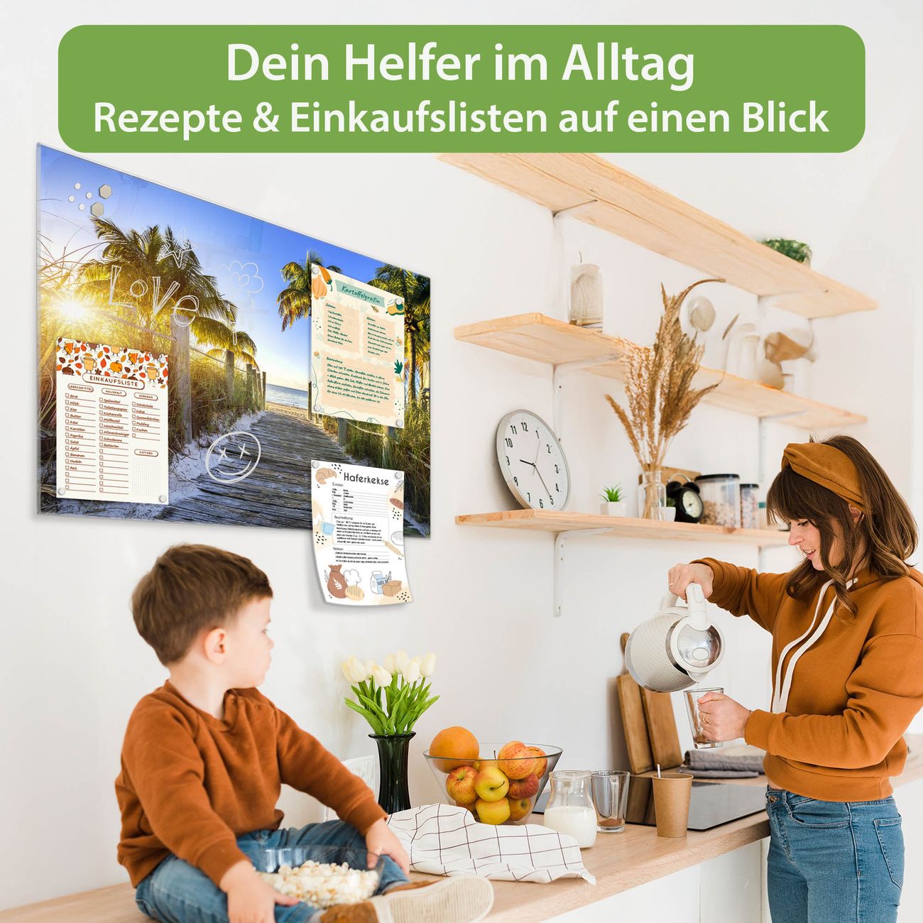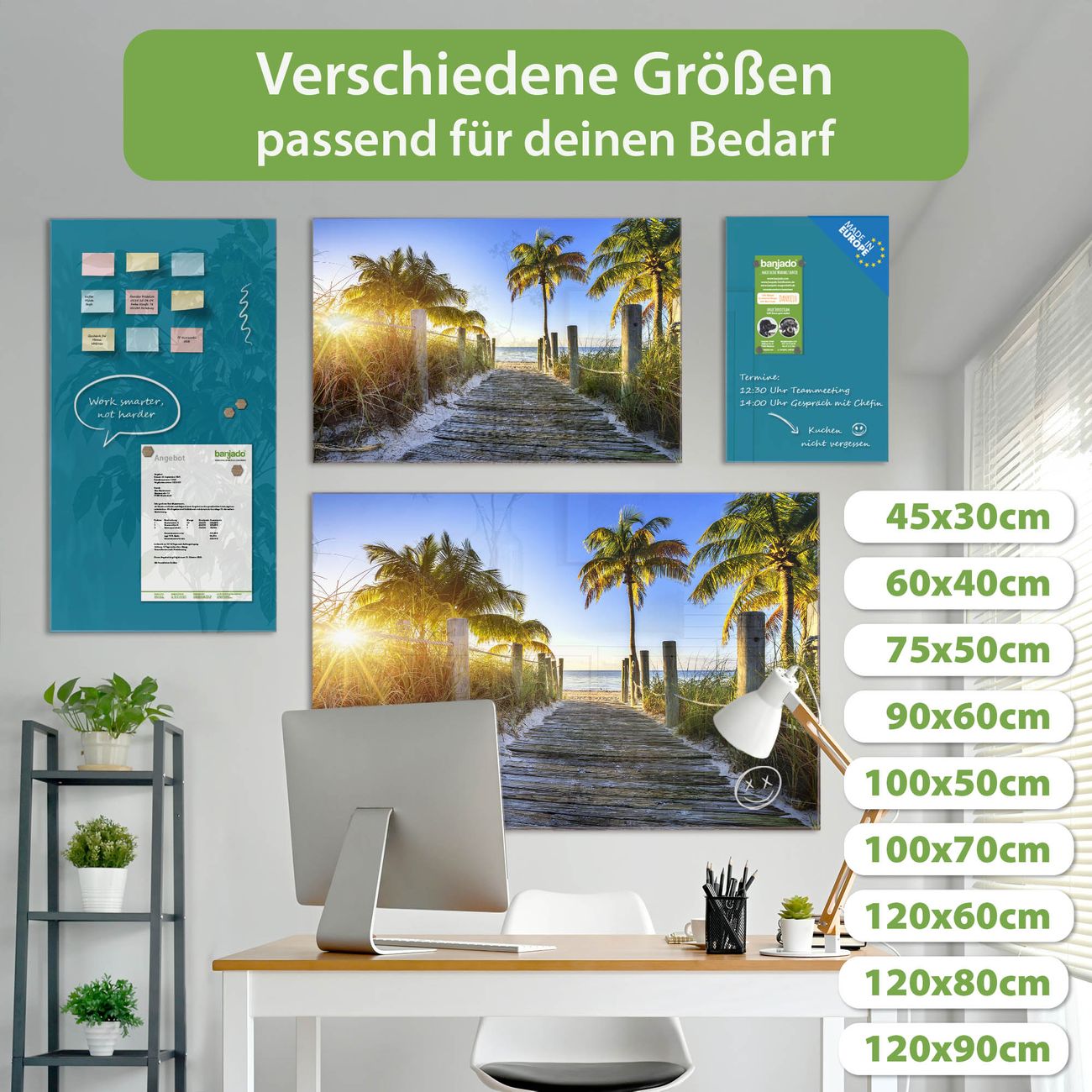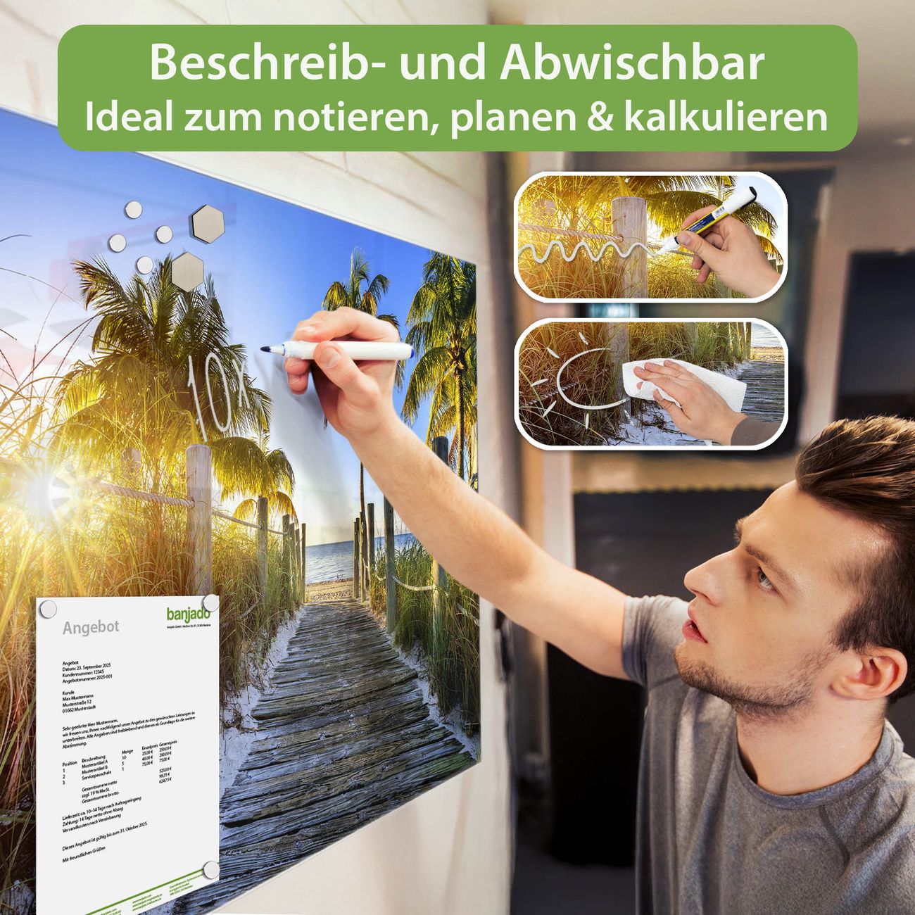 Material: 4mm Sicherheitsglas mit Metallrückwand Eigenschaften: beschreibbar, magnetisch, kratzfest Maße: 90x60x0,6cm, 8,10kg schwer Motiv Nummer 12050 Weg zum Strand Zubehör: inklusive 4 Neodym-Magnete