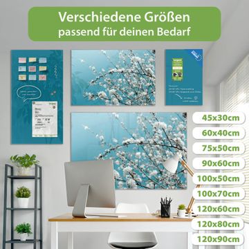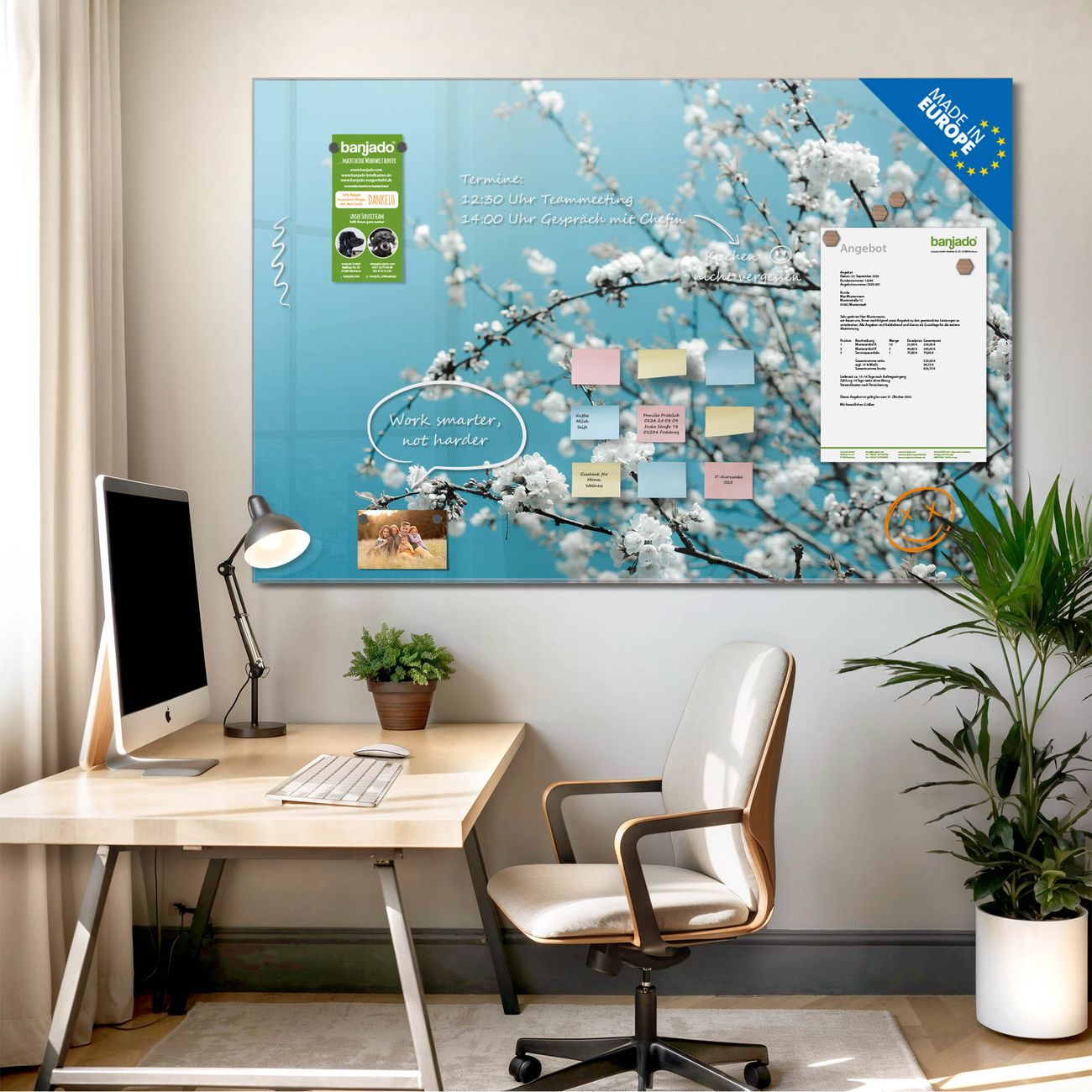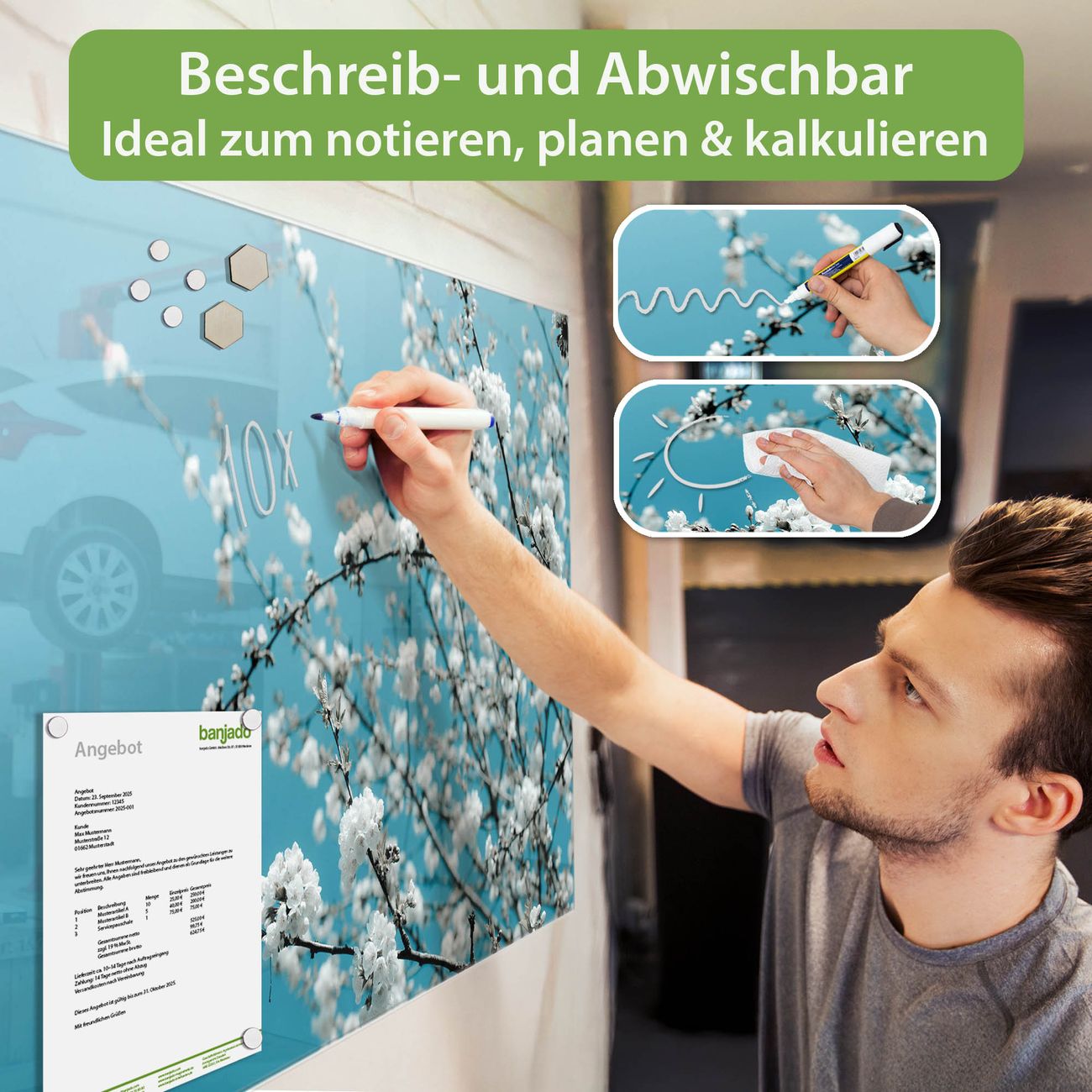 Die banjado Glas Magnettafel mit dem Motiv Motiv weiße Kirschblüten verbindet Funktionalität mit Stil. Sie ersetzt das Zettelchaos durch klare Strukturen und bringt dabei eine warme, natürliche Atmosphäre in Ihr Zuhause. Ob im Büro, in der Küche oder im Eingangsbereich - dieses Design-Board zieht Blicke an und sorgt für Ordnung mit Charakter.