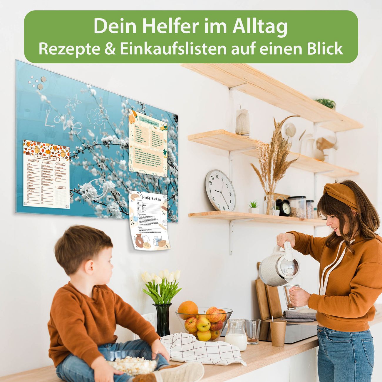 Ein Stück Design, das Ihren Alltag organisiert. Schreiben, heften, inspirieren - alles an einem Ort. Qualität, die man spürt. Montage leicht gemacht. Handwerk mit Herz - veredelt in Sachsen. Einzigartiges Design mit Motiv Motiv weiße Kirschblüten Beschreibbare Glasoberfläche, leicht zu reinigen Starke Magnetkraft durch Stahlrückwand Inklusive 4 Neodym-Magneten Flexible Montageoptionen Handveredelt in Sachsen - Qualität, die bleibt
