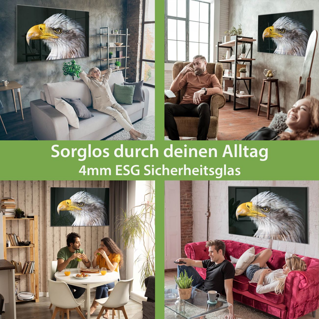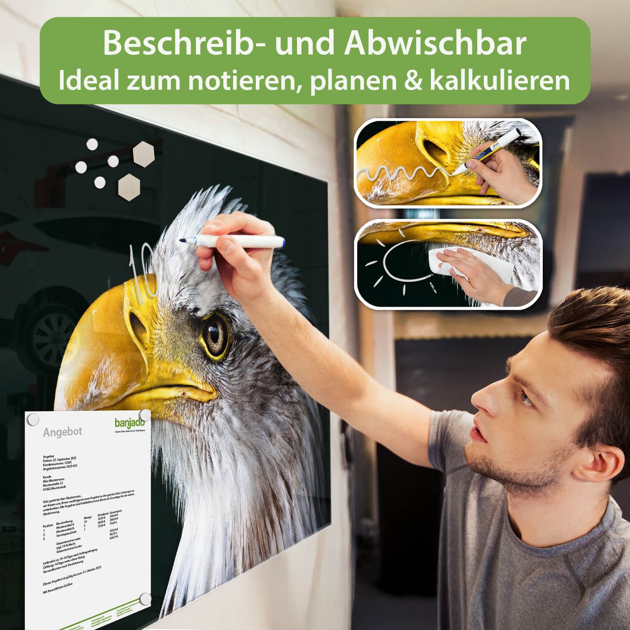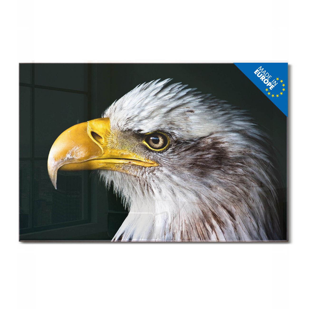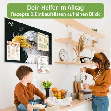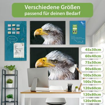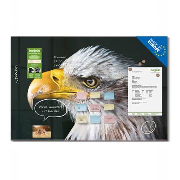 Material: 4mm Sicherheitsglas mit Metallrückwand Eigenschaften: beschreibbar, magnetisch, kratzfest Maße: 90x60x0,6cm, 8,10kg schwer Motiv Nummer 12986 Weißkopfseeadler Zubehör: inklusive 4 Neodym-Magnete