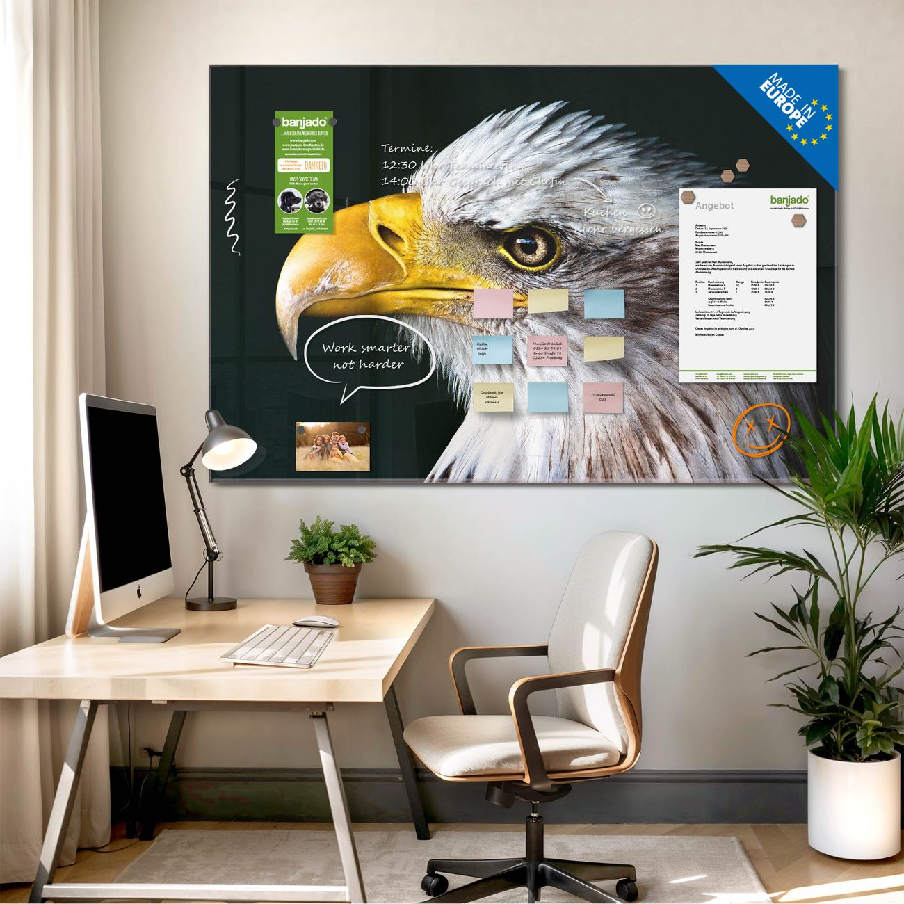 Jede Glas Magnettafel wird in unserer Werkstatt von Hand gefertigt und sorgfältig geprüft. So erhalten Sie ein echtes Qualitätsprodukt, das Funktion und Ästhetik perfekt vereint.?? Warum banjado?