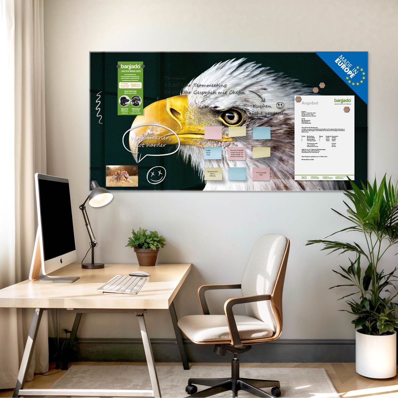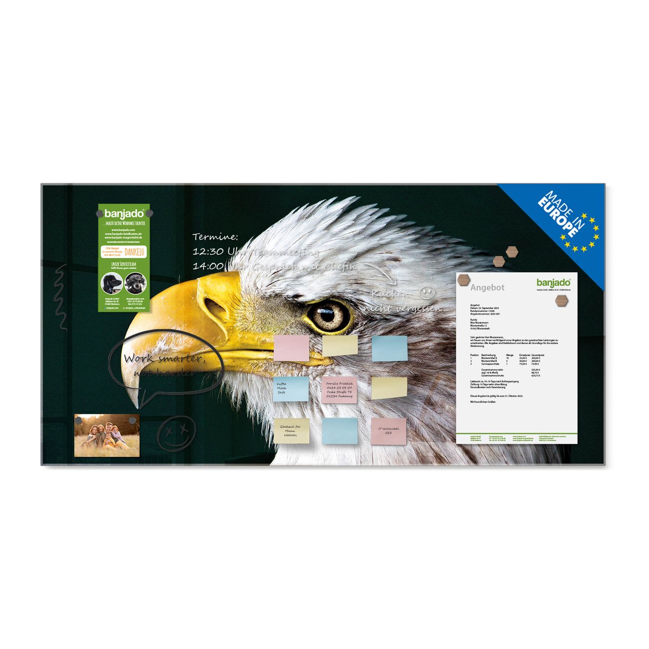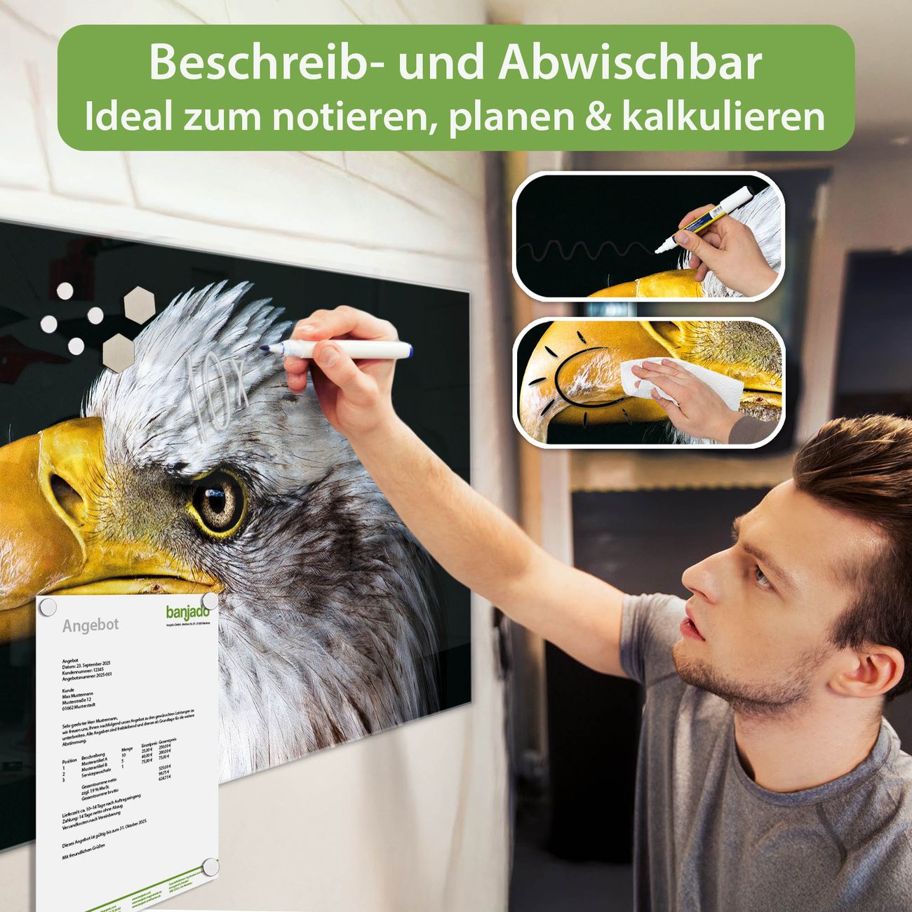 Material: 4mm Sicherheitsglas mit Metallrückwand Eigenschaften: beschreibbar, magnetisch, kratzfest Maße: 120x80x0,6cm, 14,40kg schwer Motiv Nummer 12986 Weißkopfseeadler Zubehör: inklusive 4 Neodym-Magnete
