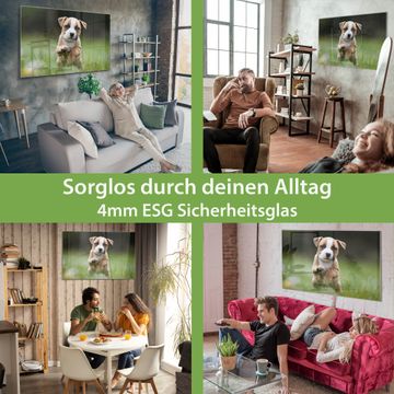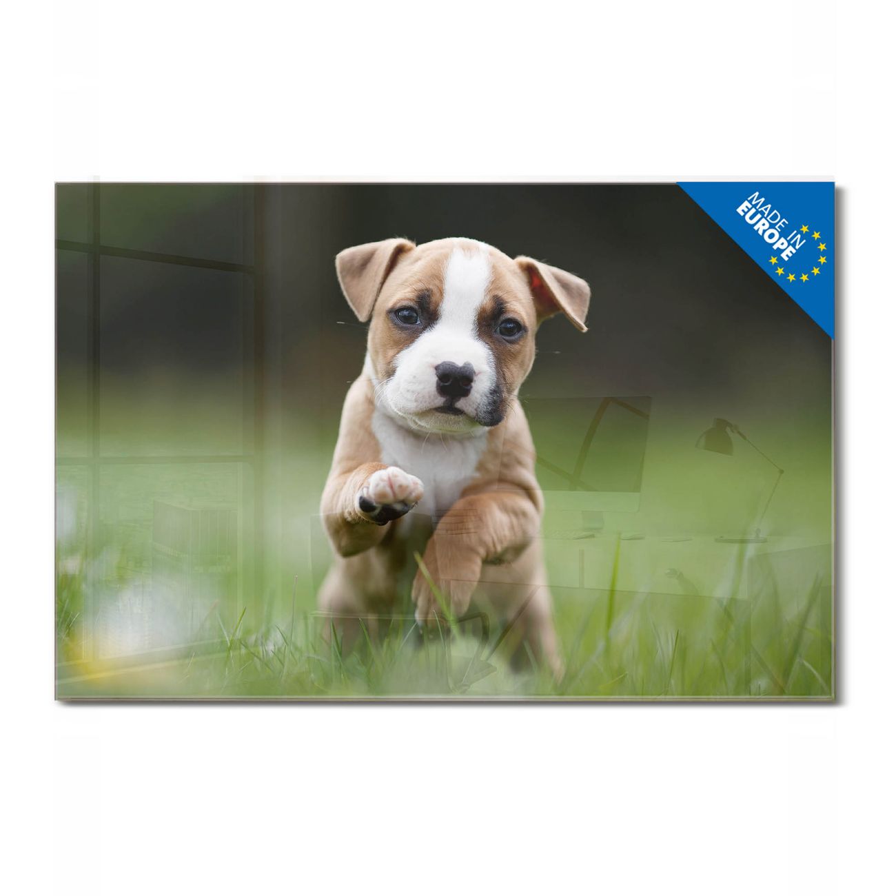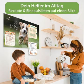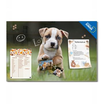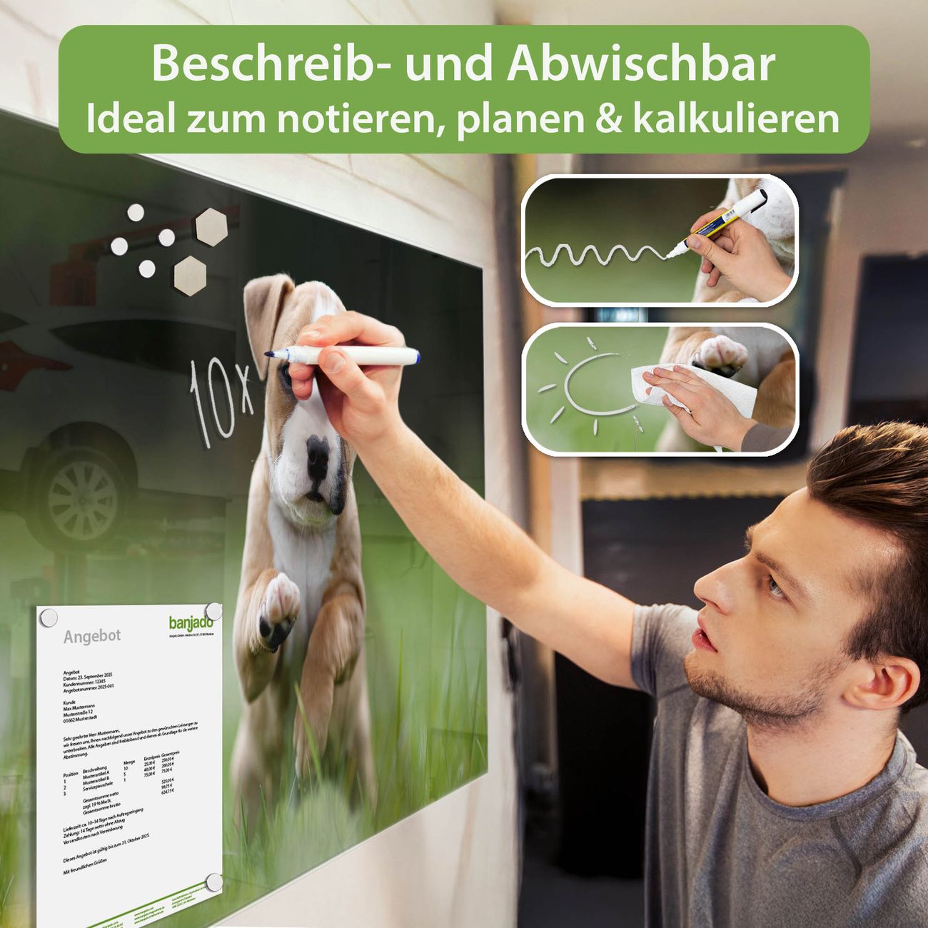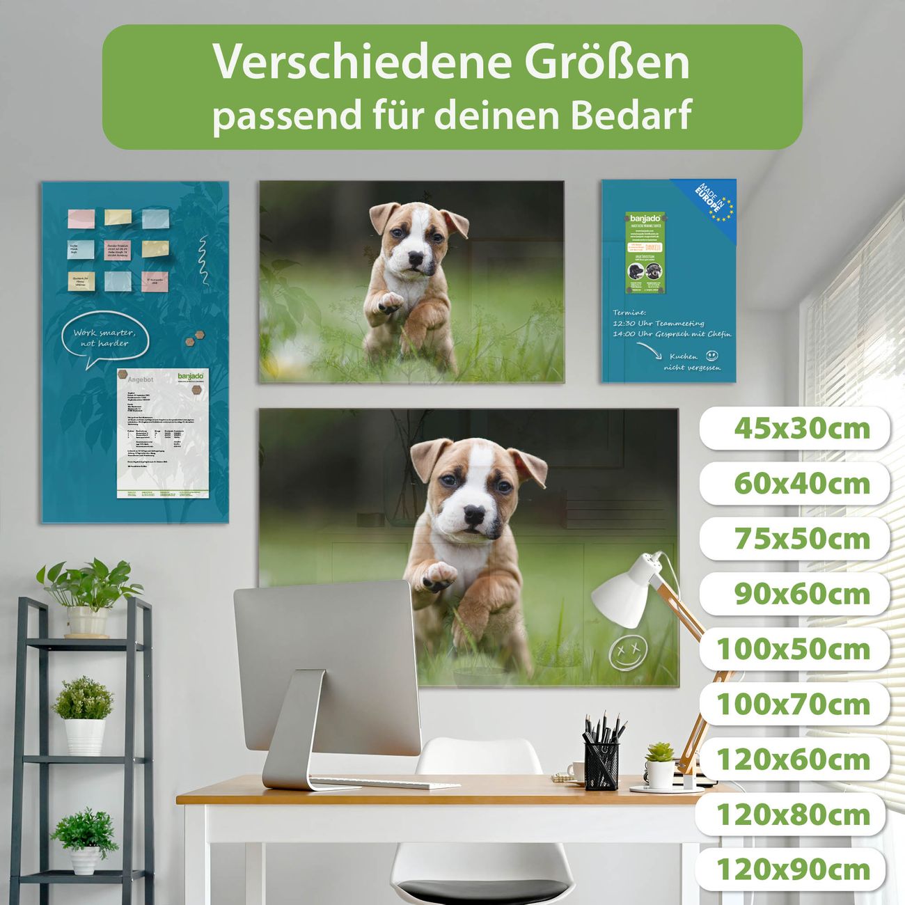 Material: 4mm Sicherheitsglas mit Metallrückwand Eigenschaften: beschreibbar, magnetisch, kratzfest Maße: 75x50x0,6cm, 5,63kg schwer Motiv Nummer 12977 Welpe im Gras Zubehör: inklusive 4 Neodym-Magnete