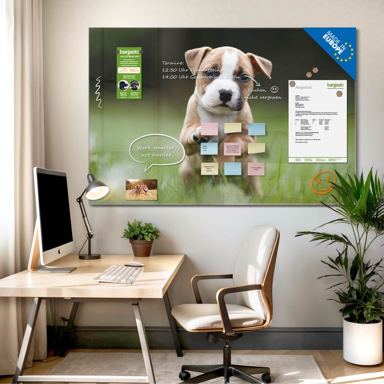 Die banjado Glas Magnettafel mit dem Motiv Motiv Welpe im Gras verbindet Funktionalität mit Stil. Sie ersetzt das Zettelchaos durch klare Strukturen und bringt dabei eine warme, natürliche Atmosphäre in Ihr Zuhause. Ob im Büro, in der Küche oder im Eingangsbereich - dieses Design-Board zieht Blicke an und sorgt für Ordnung mit Charakter.