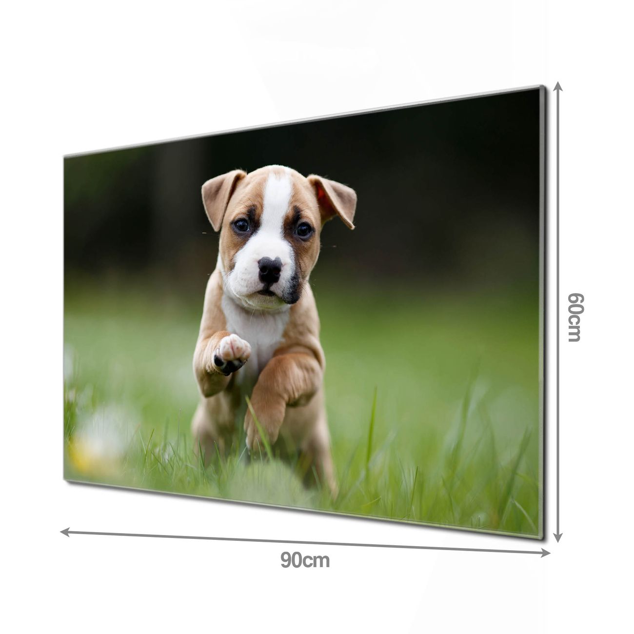 Material: 4mm Sicherheitsglas mit Metallrückwand Eigenschaften: beschreibbar, magnetisch, kratzfest Maße: 90x60x0,6cm, 8,10kg schwer Motiv Nummer 12977 Welpe im Gras Zubehör: inklusive 4 Neodym-Magnete