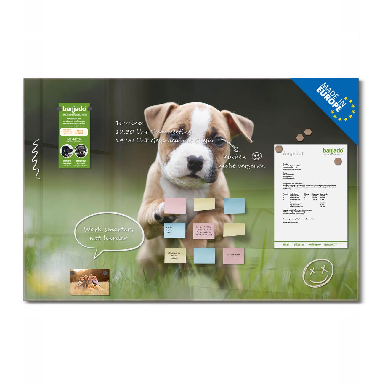 Material: 4mm Sicherheitsglas mit Metallrückwand Eigenschaften: beschreibbar, magnetisch, kratzfest Maße: 120x80x0,6cm, 14,40kg schwer Motiv Nummer 12977 Welpe im Gras Zubehör: inklusive 4 Neodym-Magnete