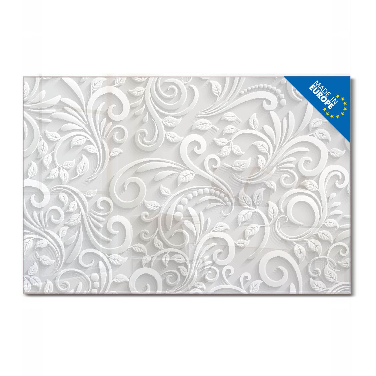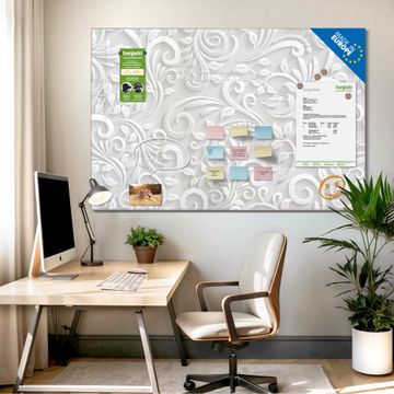 Material: 4mm Sicherheitsglas mit Metallrückwand Eigenschaften: beschreibbar, magnetisch, kratzfest Maße: 120x80x0,6cm, 14,40kg schwer Motiv Nummer 12946 White Swirl Zubehör: inklusive 4 Neodym-Magnete