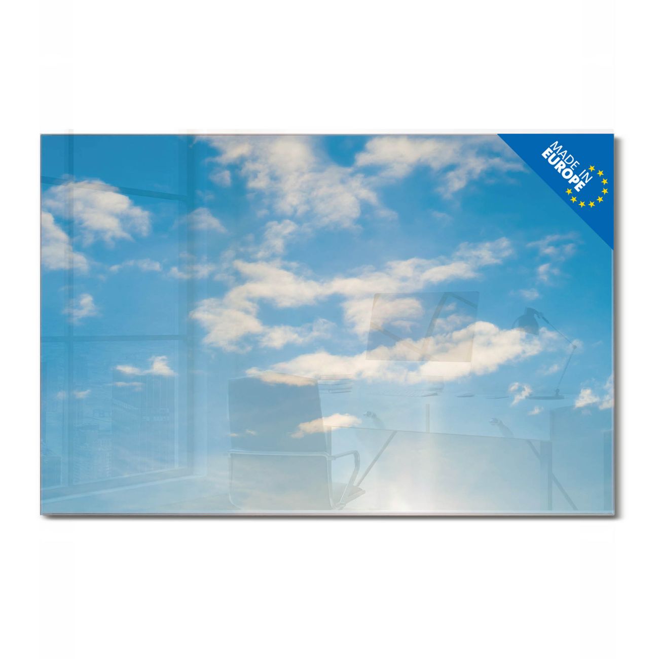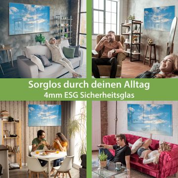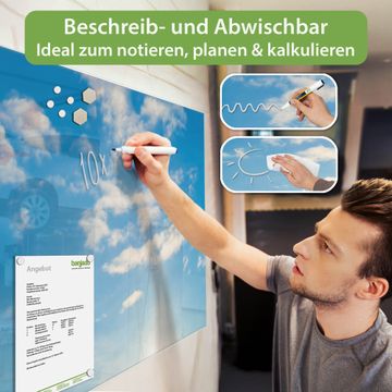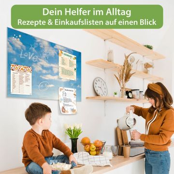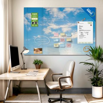 Material: 4mm Sicherheitsglas mit Metallrückwand Eigenschaften: beschreibbar, magnetisch, kratzfest Maße: 75x50x0,6cm, 5,63kg schwer Motiv Nummer 12840 Wolken 11 Zubehör: inklusive 4 Neodym-Magnete