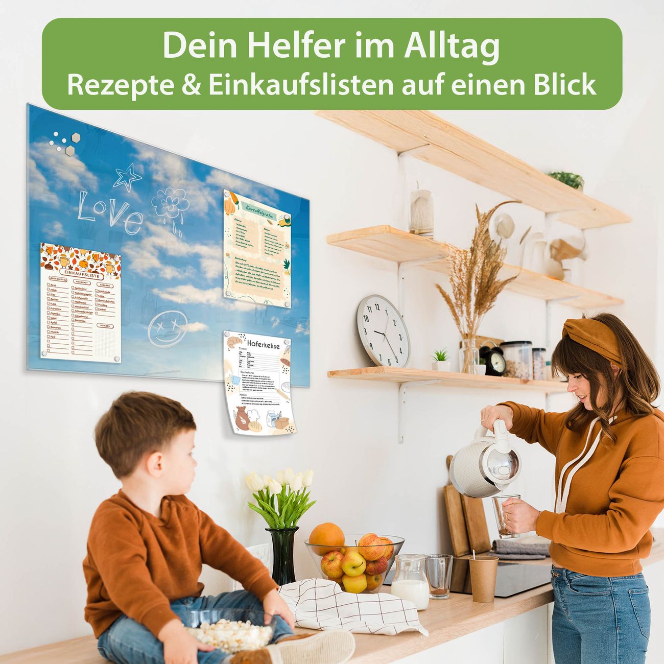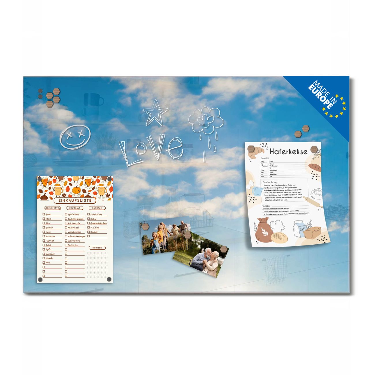 Auf der glatten Glasoberfläche lassen sich Termine, Rezepte oder Notizen ganz einfach mit Kreidestiften festhalten und rückstandslos entfernen. Starke Neodym-Magnete halten Ihre wichtigsten Erinnerungen sicher an Ort und Stelle. So entsteht Ihre ganz persönliche Ideenwand - jeden Tag neu.