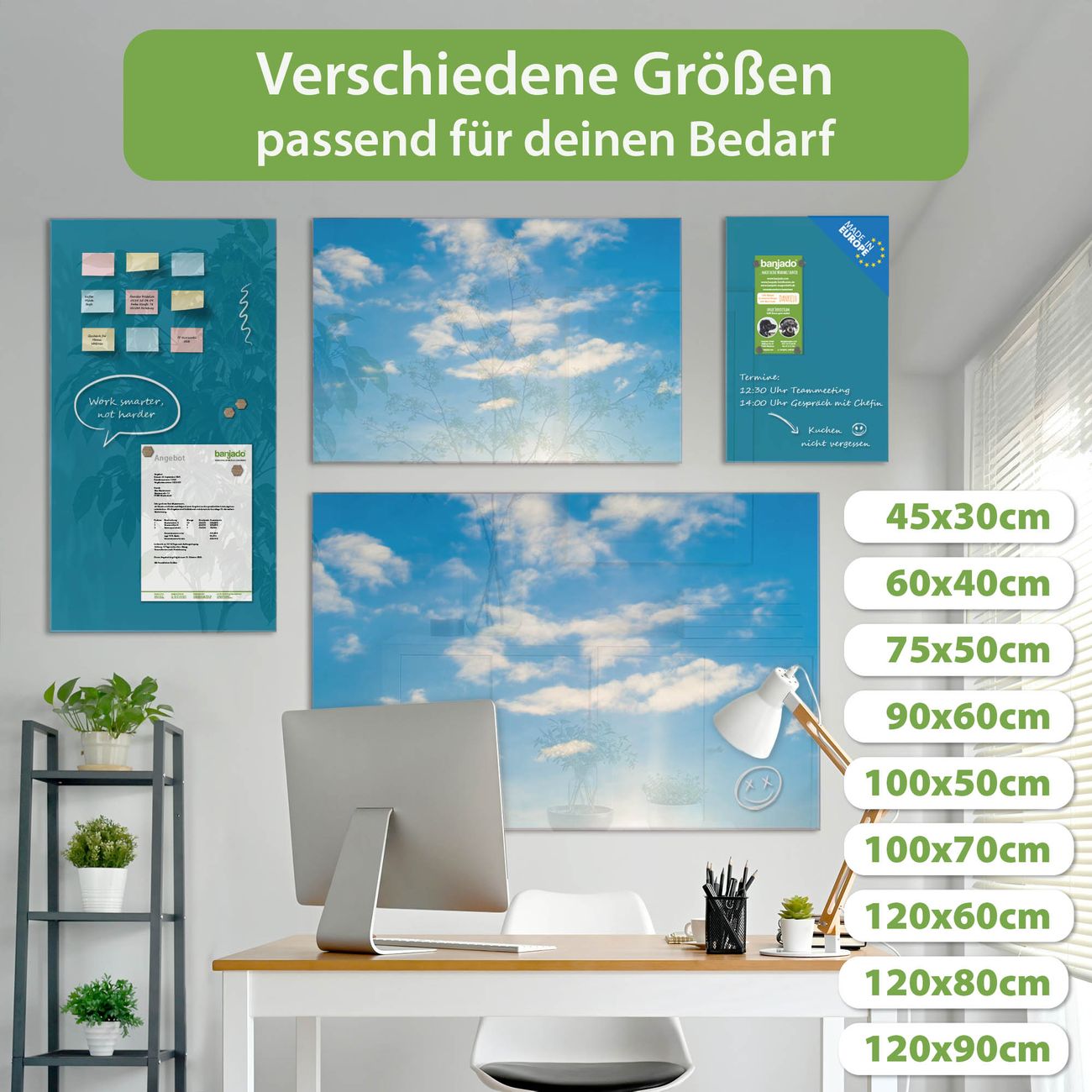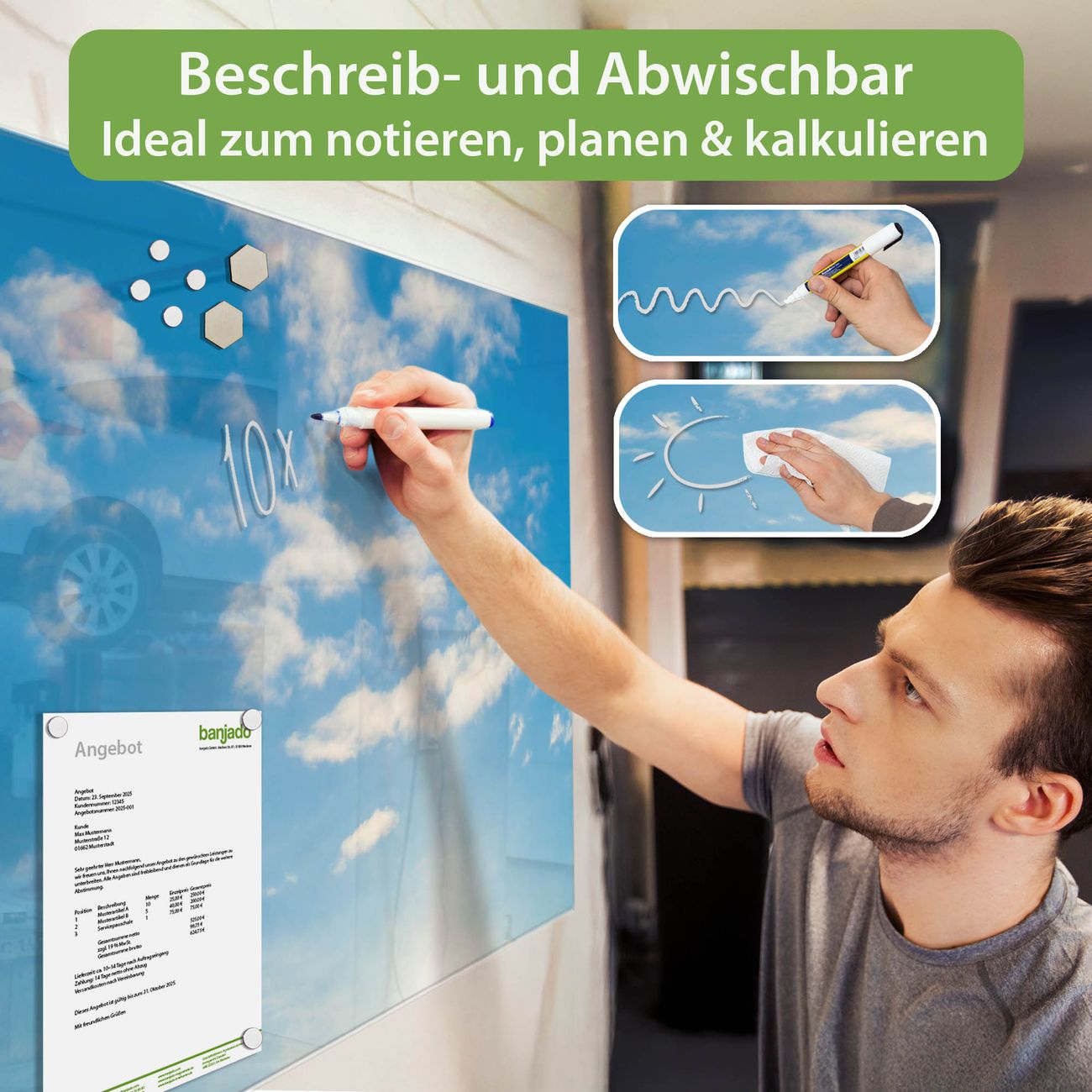 Jede Glas Magnettafel wird in unserer Werkstatt von Hand gefertigt und sorgfältig geprüft. So erhalten Sie ein echtes Qualitätsprodukt, das Funktion und Ästhetik perfekt vereint.?? Warum banjado?