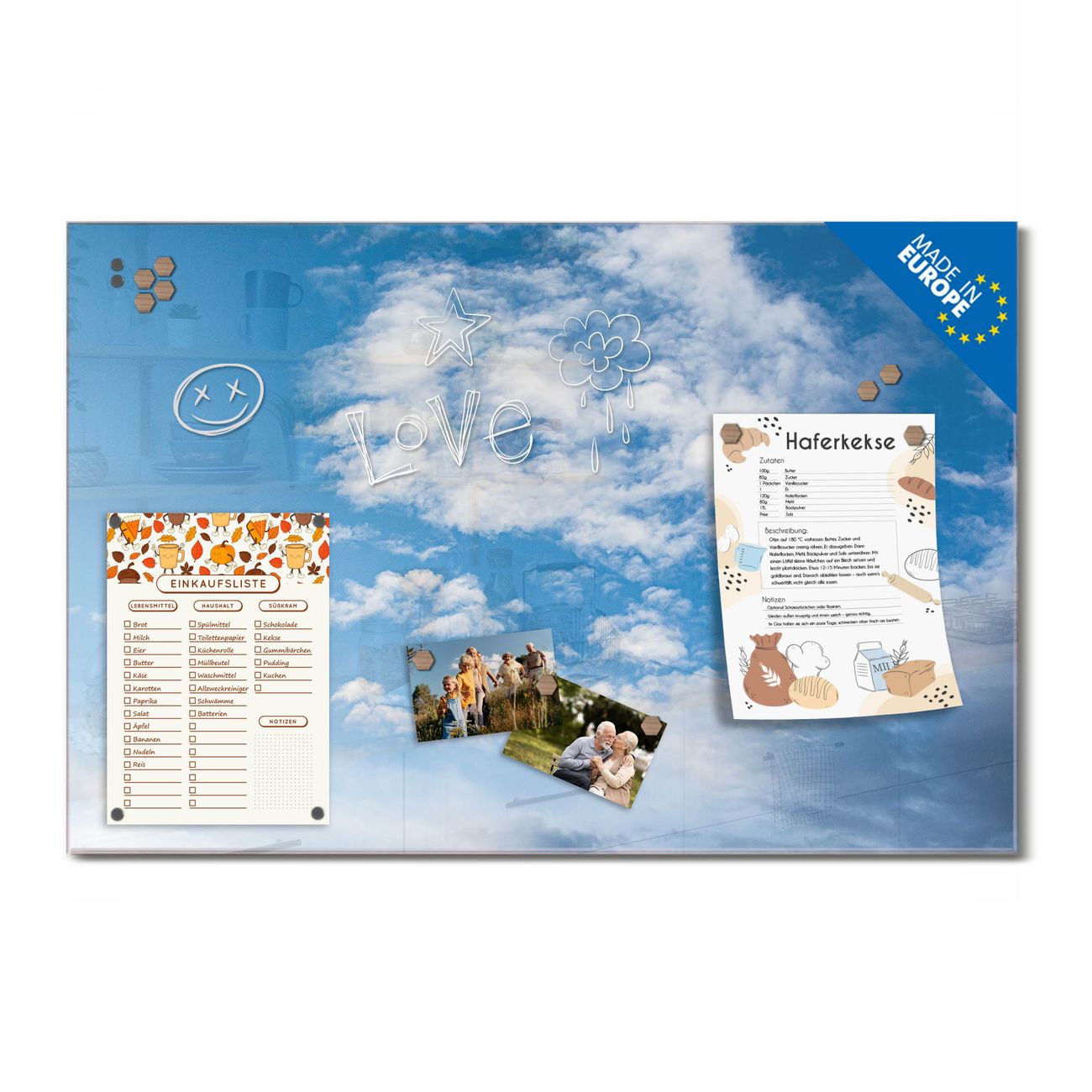 Material: 4mm Sicherheitsglas mit Metallrückwand Eigenschaften: beschreibbar, magnetisch, kratzfest Maße: 75x50x0,6cm, 5,63kg schwer Motiv Nummer 12830 Wolken 1 Zubehör: inklusive 4 Neodym-Magnete