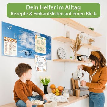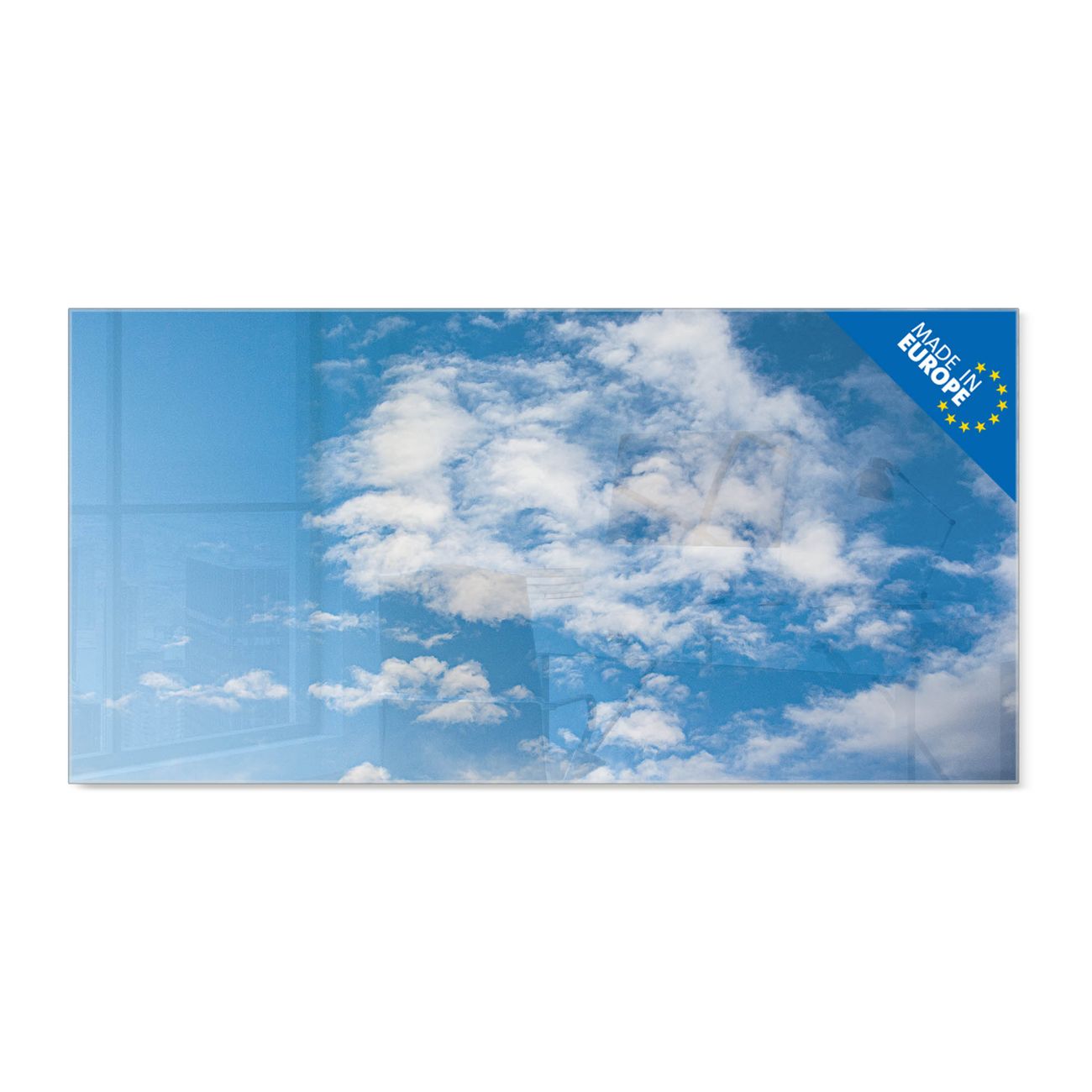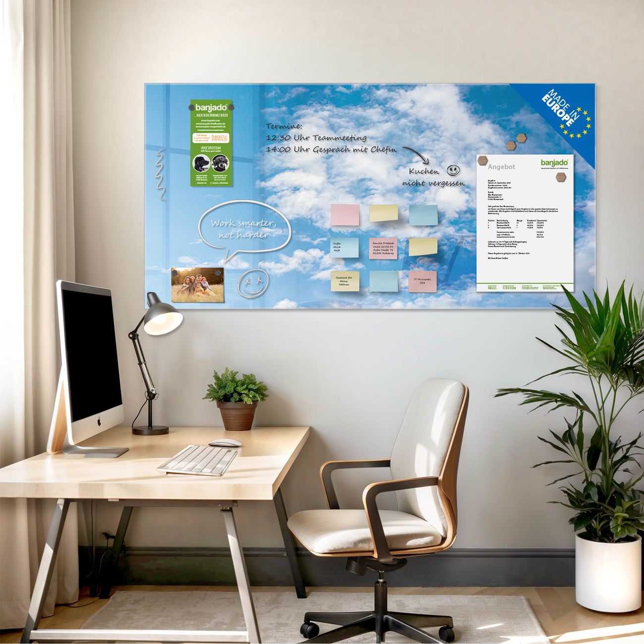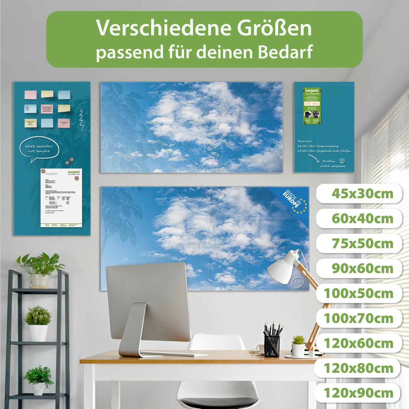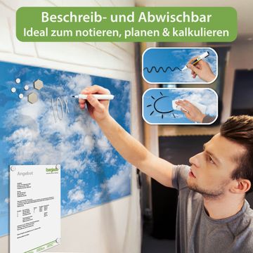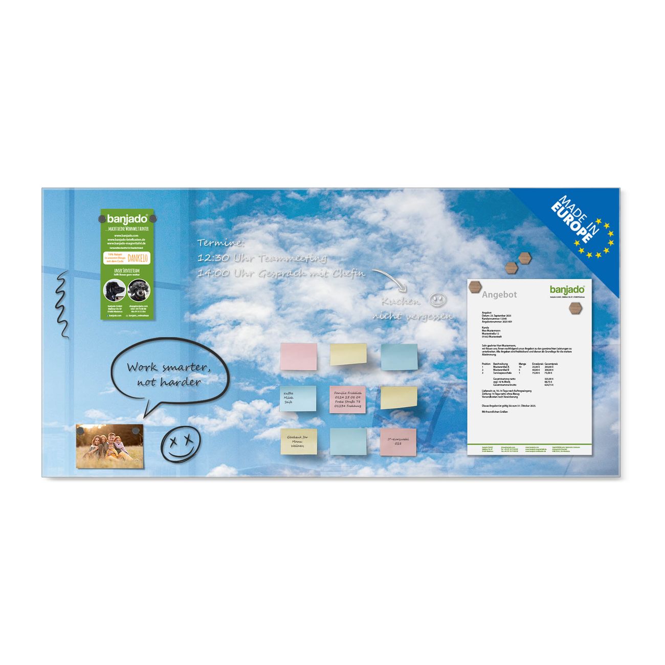 Material: 4mm Sicherheitsglas mit Metallrückwand Eigenschaften: beschreibbar, magnetisch, kratzfest Maße: 100x50x0,6cm, 7,50kg schwer Motiv Nummer 12830 Wolken 1 Zubehör: inklusive 4 Neodym-Magnete
