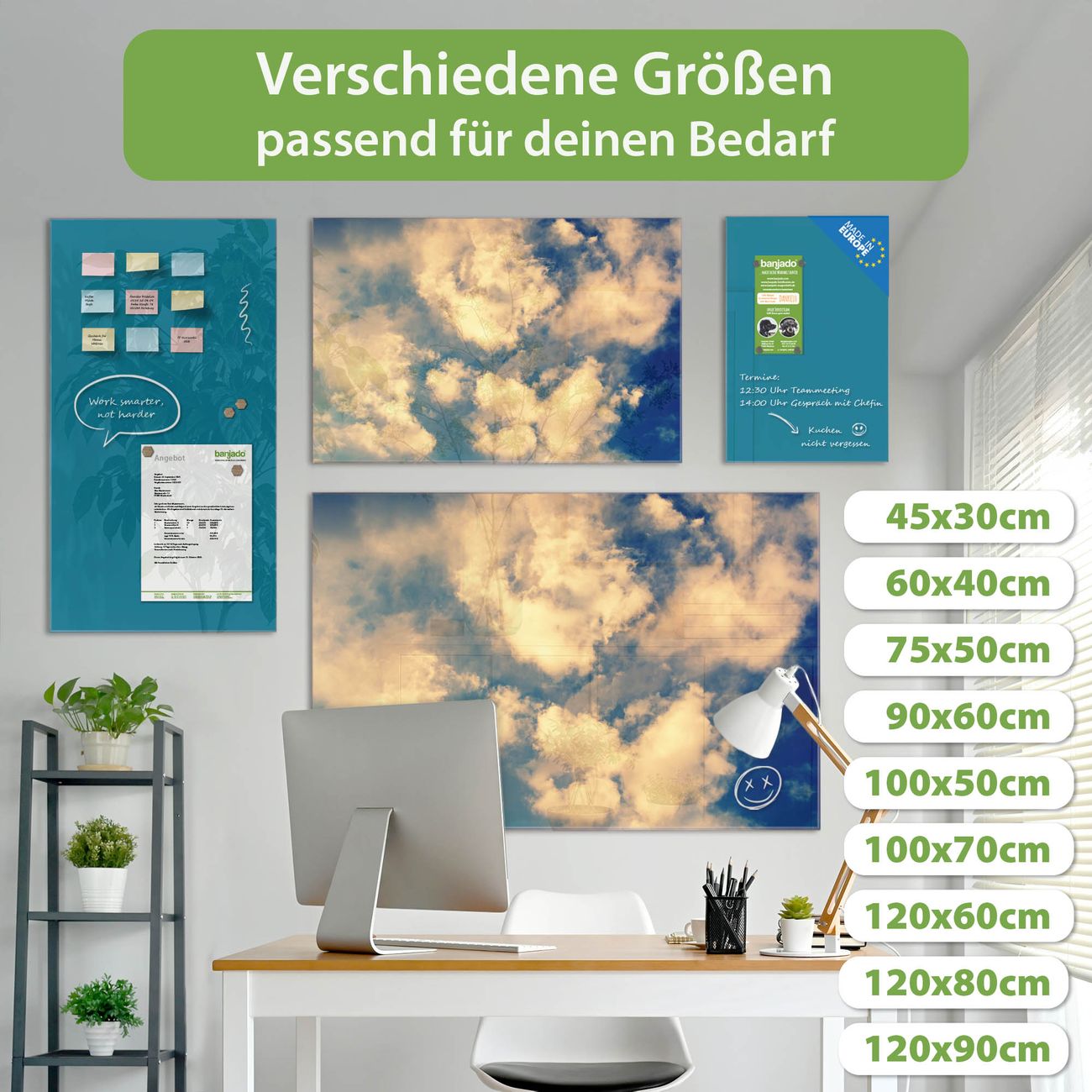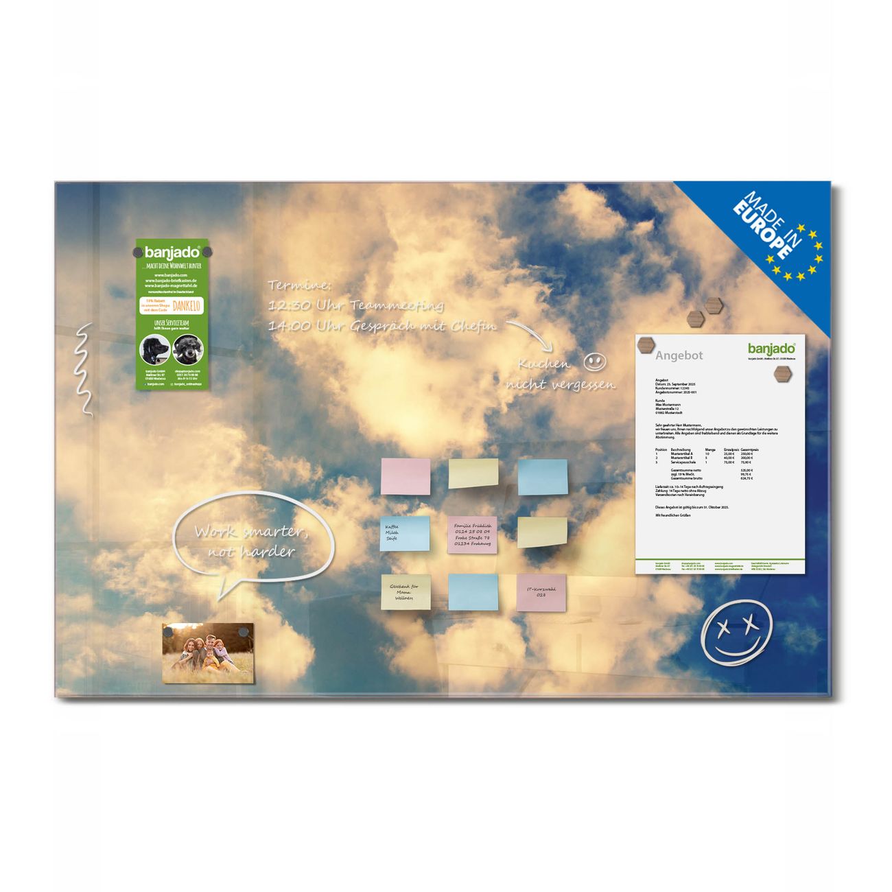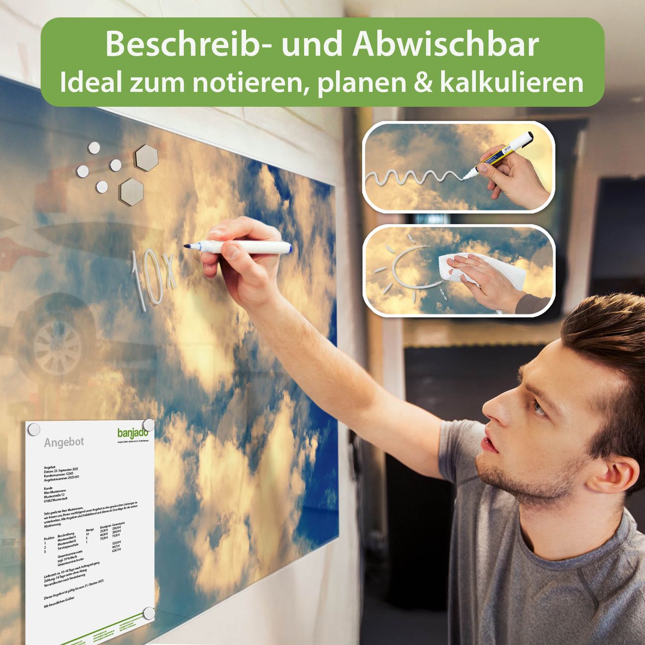 Material: 4mm Sicherheitsglas mit Metallrückwand Eigenschaften: beschreibbar, magnetisch, kratzfest Maße: 90x60x0,6cm, 8,10kg schwer Motiv Nummer 12832 Wolken 3 Zubehör: inklusive 4 Neodym-Magnete