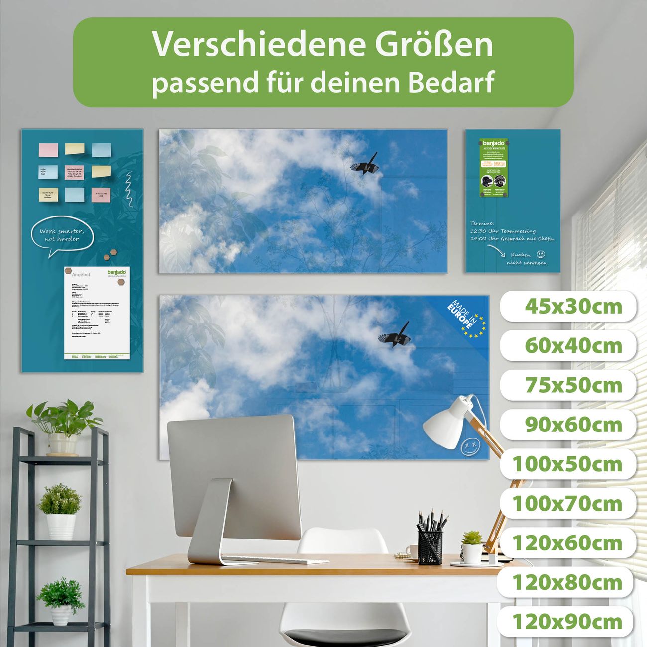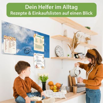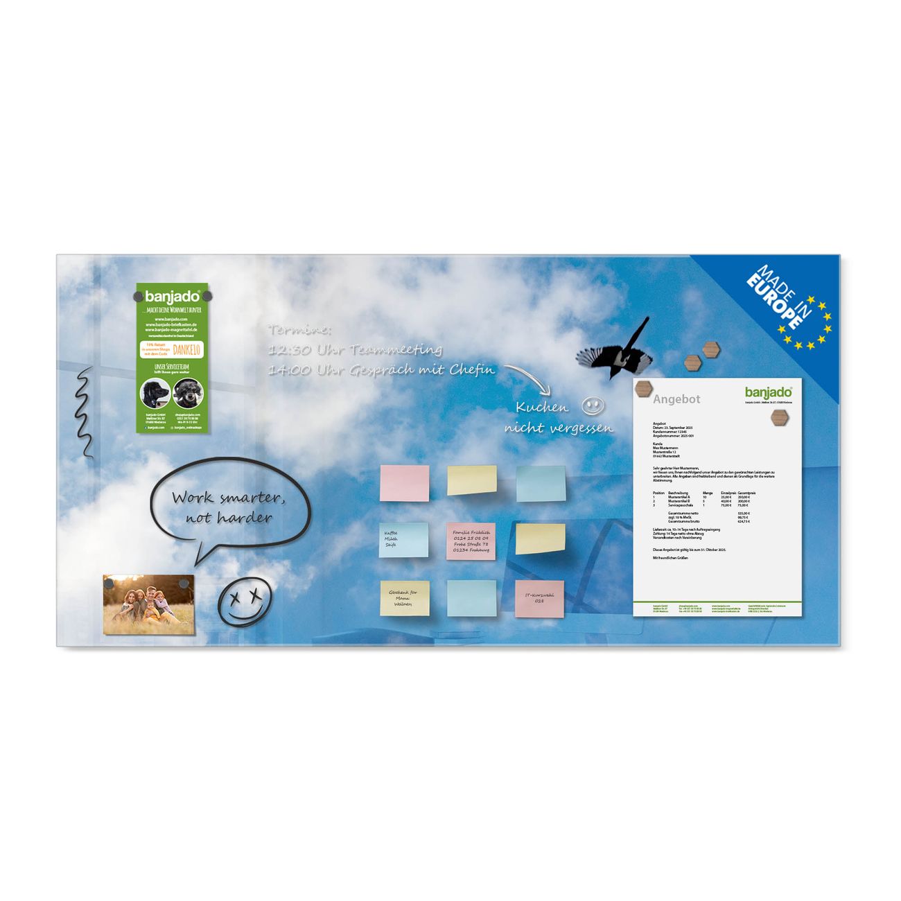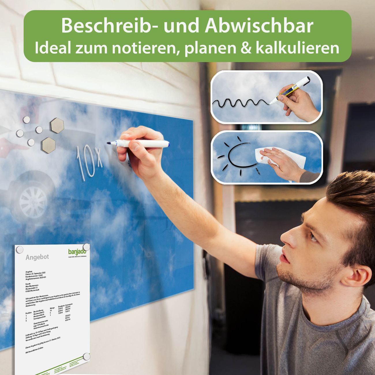 Material: 4mm Sicherheitsglas mit Metallrückwand Eigenschaften: beschreibbar, magnetisch, kratzfest Maße: 100x50x0,6cm, 7,50kg schwer Motiv Nummer 12833 Wolken 4 Zubehör: inklusive 4 Neodym-Magnete