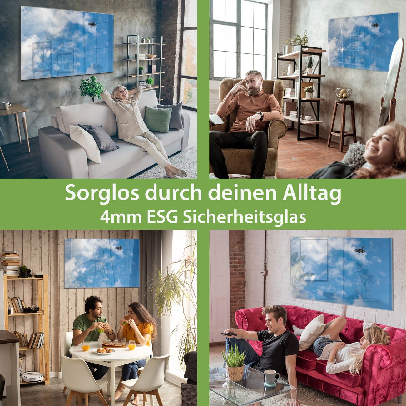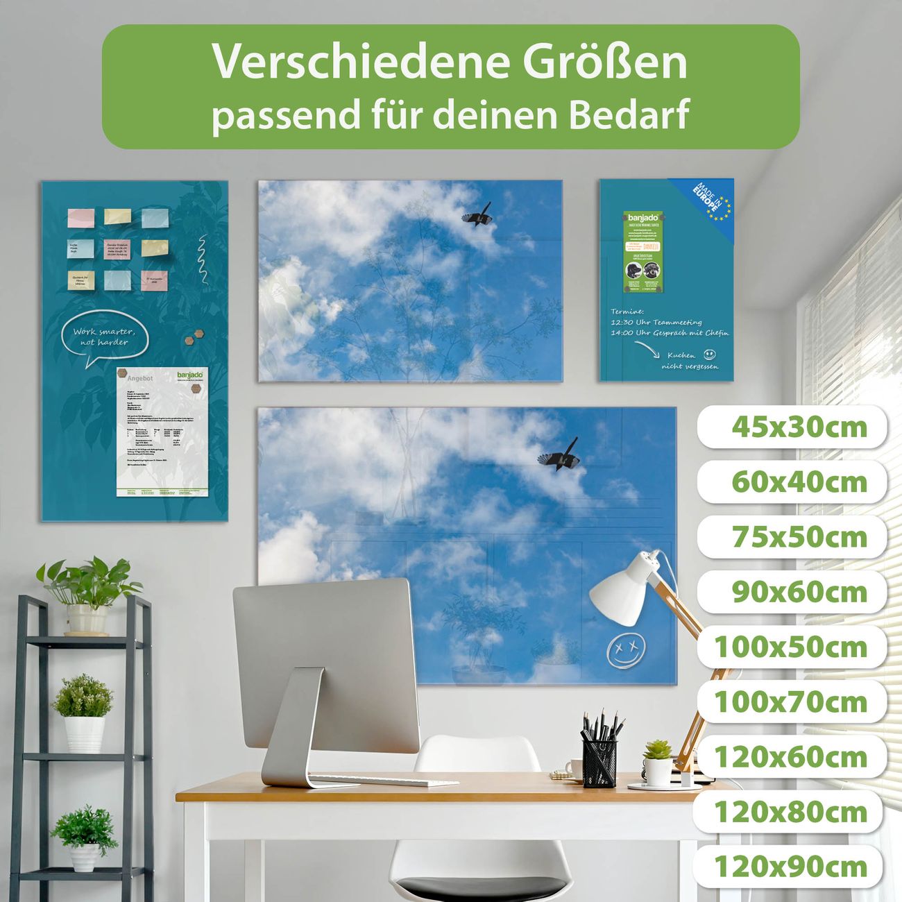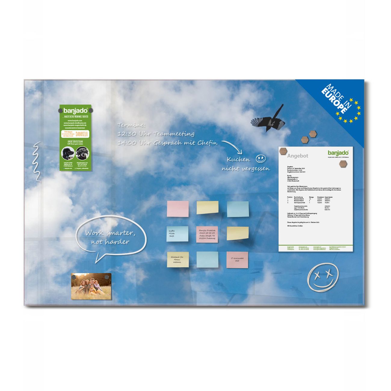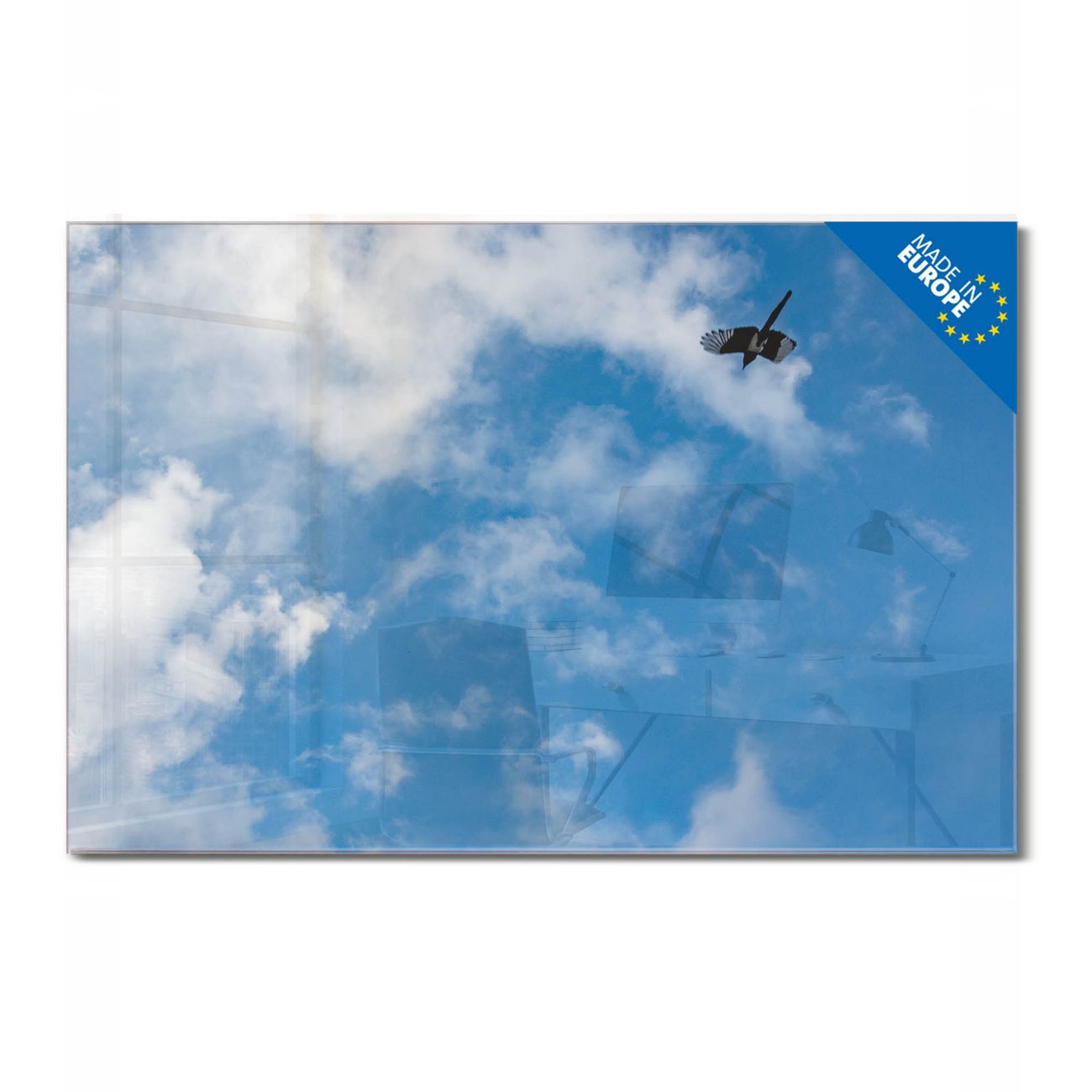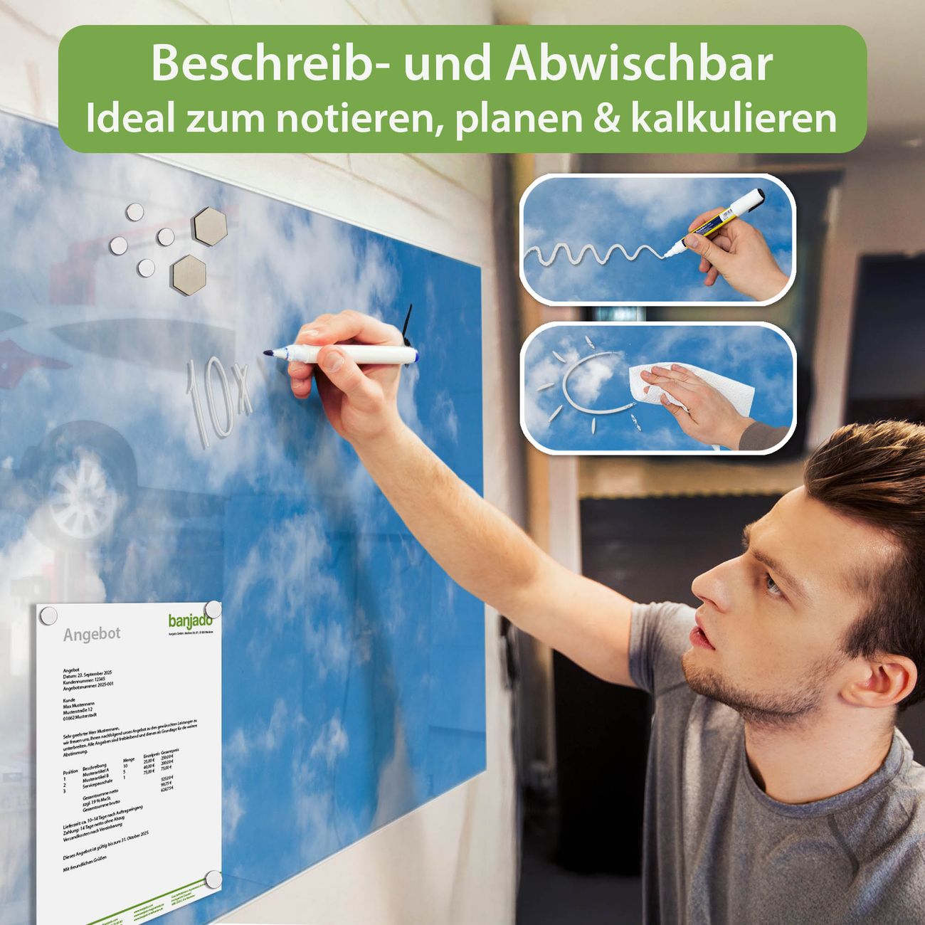 Material: 4mm Sicherheitsglas mit Metallrückwand Eigenschaften: beschreibbar, magnetisch, kratzfest Maße: 120x80x0,6cm, 14,40kg schwer Motiv Nummer 12833 Wolken 4 Zubehör: inklusive 4 Neodym-Magnete
